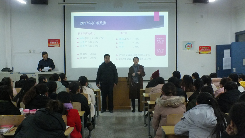 此次講座由去西安參加2018年護考師資培訓(xùn)的牛子勁老師主講。牛老師分別從2017年護考成績數(shù)據(jù)分析、護考試題新特點,以及2018年護考命題的趨勢進行了詳細分析與說明,并且提出了應(yīng)對策略。他希望2015級護考生準確把握護考形勢,確定應(yīng)考學(xué)習(xí)計劃,結(jié)合護考要求加強專業(yè)課學(xué)習(xí),在明年的護考中取得好成績。