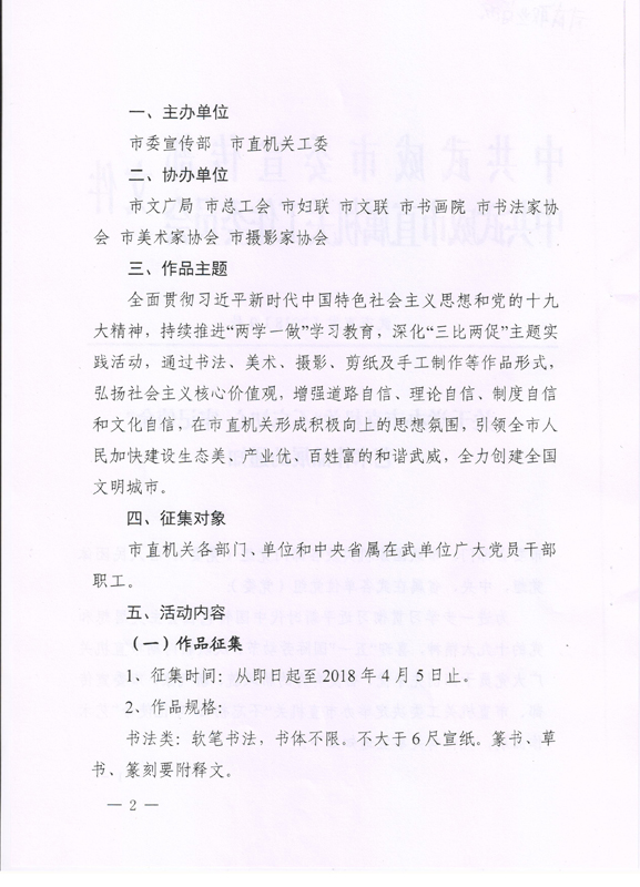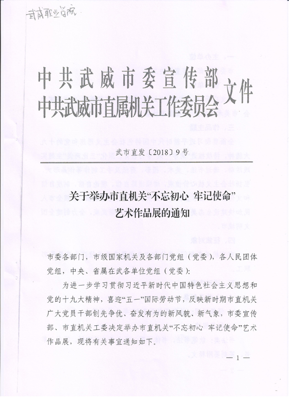 現(xiàn)將中共武威市委宣傳部、中共武威市直屬機關(guān)工作委員會《關(guān)于舉辦市直機關(guān)“不忘初心? 牢記使命”藝術(shù)作品展的通知》(武市直發(fā)〔2018〕9號)轉(zhuǎn)發(fā)你們,請各部門、單位根據(jù)要求認真組織,積極參與。將參賽作品于4月2日前報宣傳統(tǒng)戰(zhàn)部辦公室,宣傳統(tǒng)戰(zhàn)部對報送作品匯總后統(tǒng)一報送市直屬機關(guān)工委。