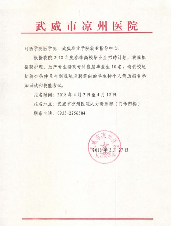 ? ? ? ?武威市涼州醫(yī)院擬招聘護理、助產(chǎn)專業(yè)畢業(yè)生10名,報名時間2018年4月2日~4月12日,報名時請攜帶個人簡歷,一寸彩色照片一張,請我系15級應屆畢業(yè)生積極響應,踴躍報名!