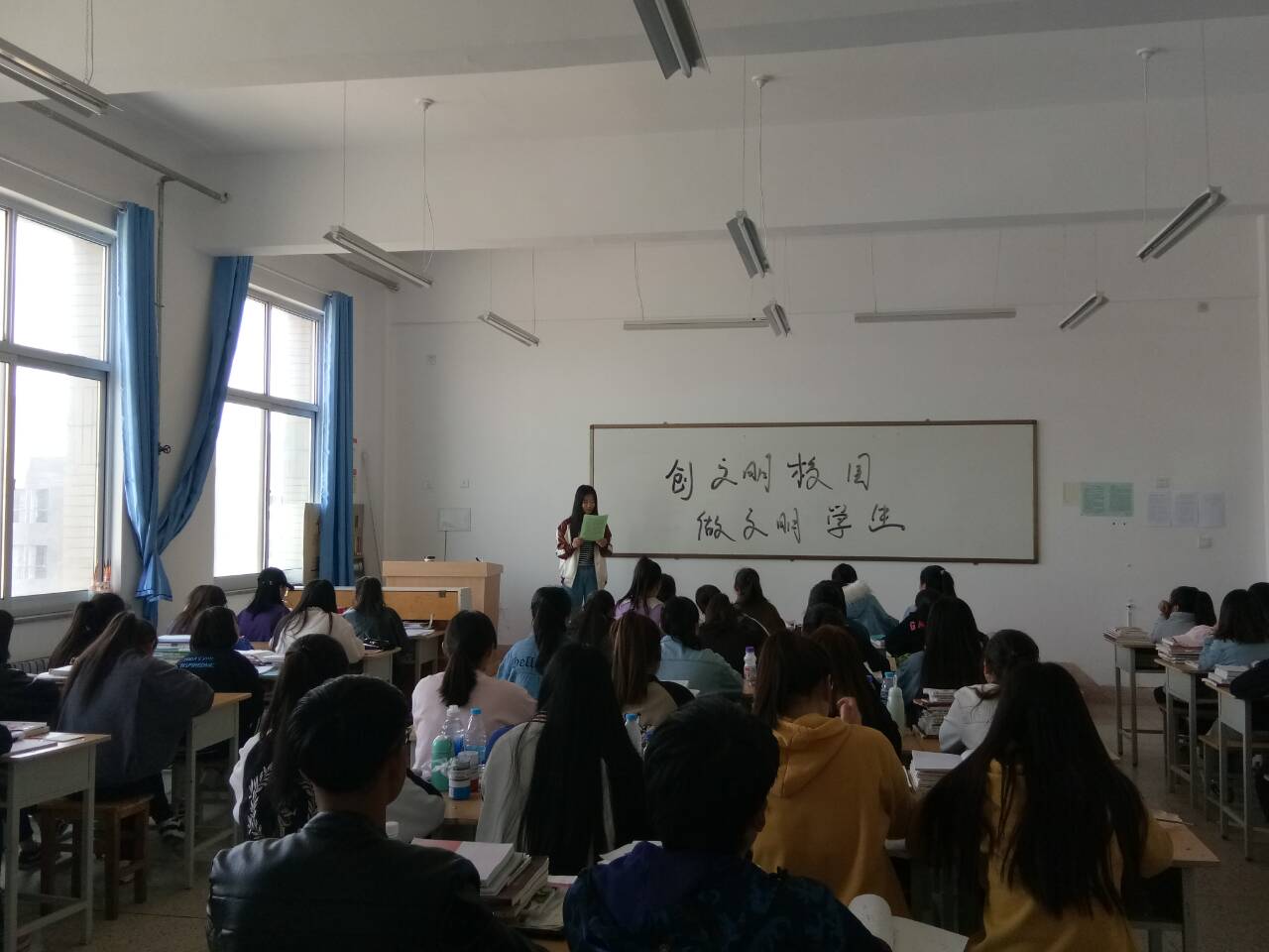 4月20日,人文藝術(shù)教育系組織全體教師學(xué)習(xí)了《中共武威職業(yè)學(xué)院委員會(huì)關(guān)于成立創(chuàng)建全國(guó)文明城市工作領(lǐng)導(dǎo)小組的通知》《武威職業(yè)學(xué)院創(chuàng)建全國(guó)文明城市三年規(guī)劃(2018-2020)》《武威職業(yè)學(xué)院創(chuàng)建全國(guó)文明城市2018年工作實(shí)施方案》文件精神,通過教研室活動(dòng),認(rèn)真學(xué)習(xí)了《你我攜手 共創(chuàng)文明》倡議書,自覺遵守教師行為守則和管理規(guī)范,自覺維護(hù)辦公室環(huán)境,以實(shí)際行動(dòng)踐行文明承諾,以模范行為影響身邊人、身邊事。學(xué)生通過主題班會(huì),學(xué)習(xí)了《創(chuàng)文明校園 做文明學(xué)生》和《共同創(chuàng)建文明城市》倡議書,自覺愛護(hù)公物,不亂貼亂畫,不亂扔垃圾,不講粗話臟話,不隨地吐痰,不破壞公共設(shè)施,用實(shí)際行動(dòng)踐行社會(huì)主義核心價(jià)值觀。