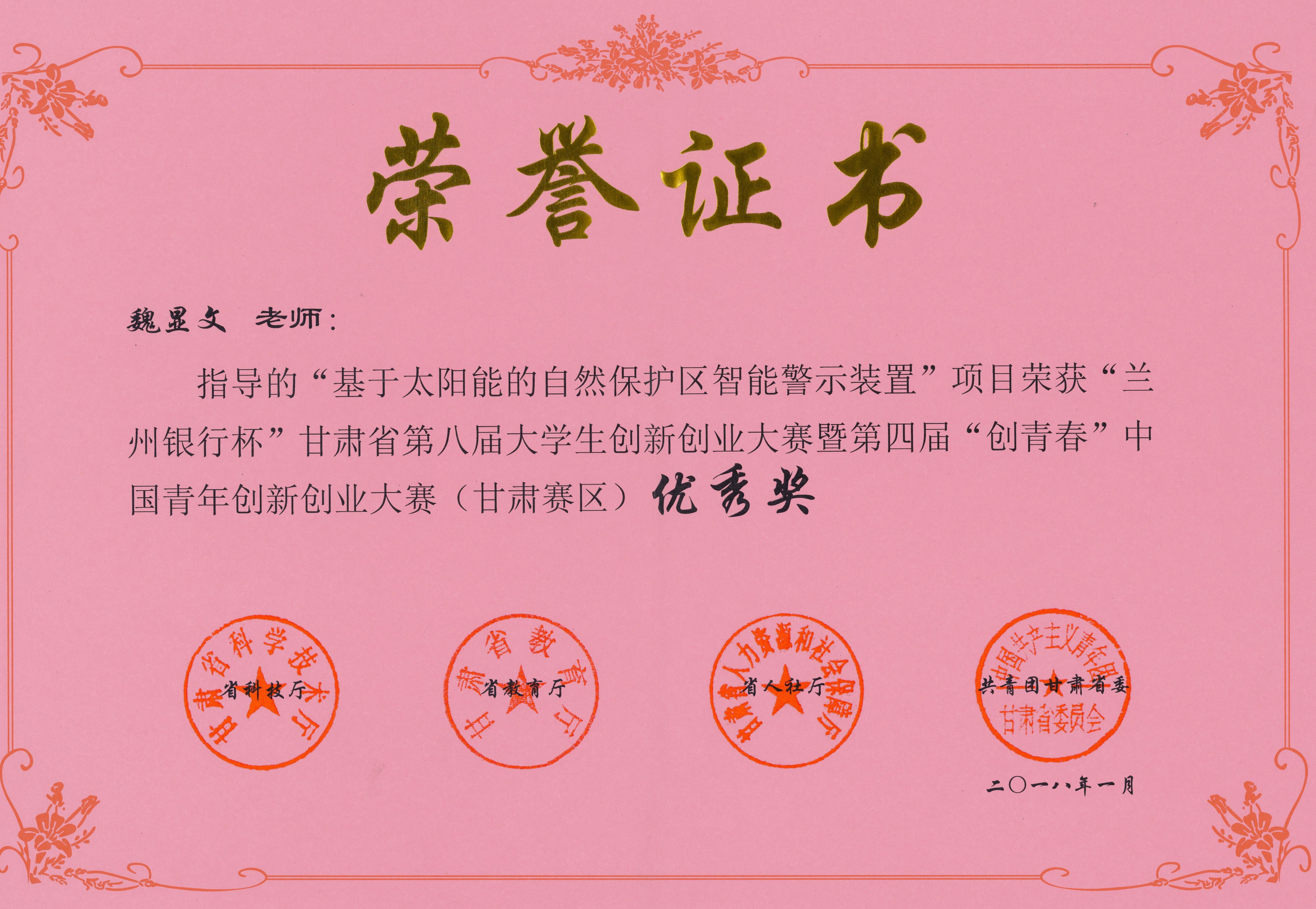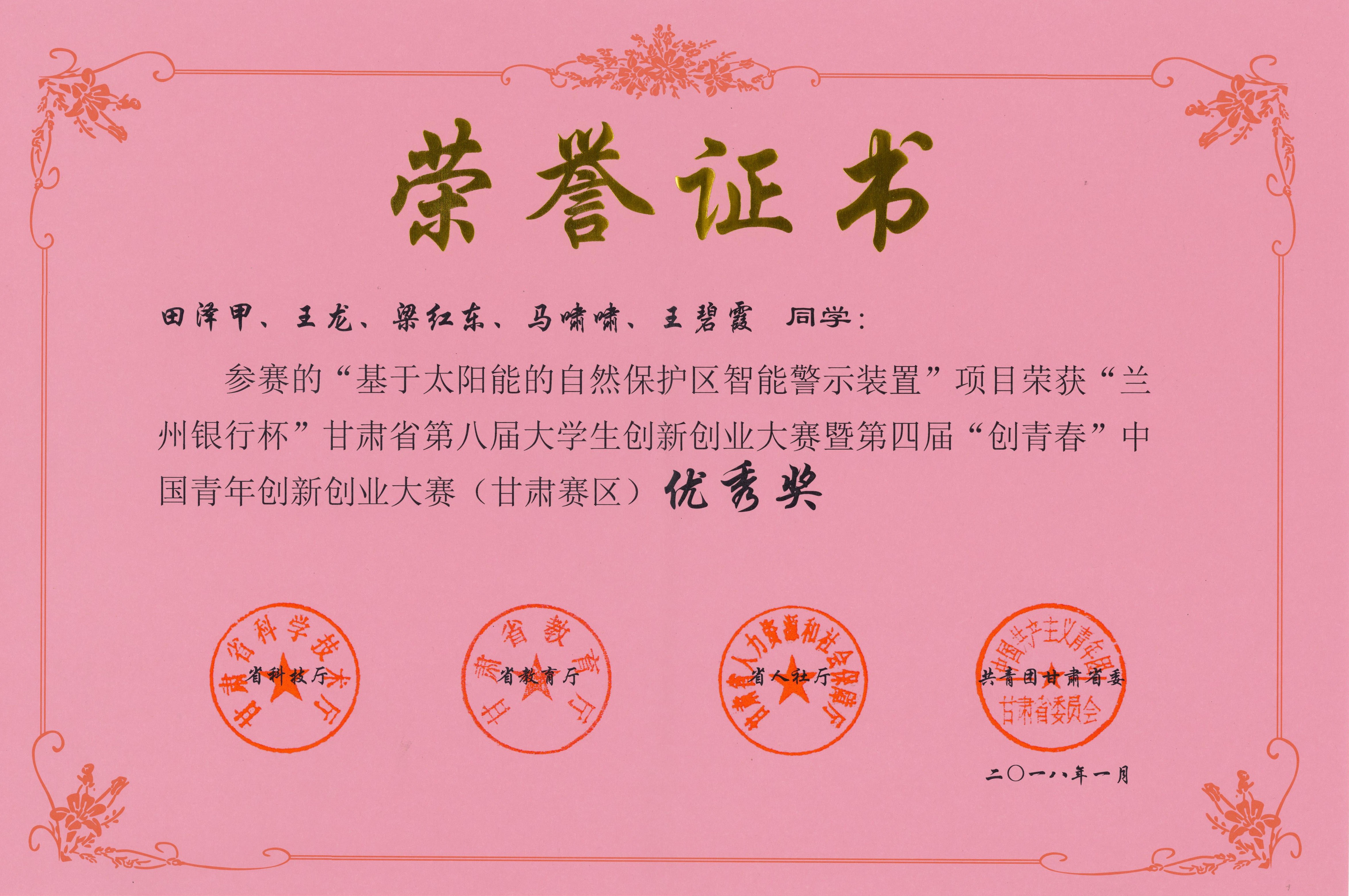 近日,從省教育廳、省科技廳、省人力資源和社會保障廳、共青團甘肅省委聯(lián)合下發(fā)的《關于公布“蘭州銀行杯”甘肅省第八屆大學生創(chuàng)新創(chuàng)業(yè)大賽暨第四屆“創(chuàng)青春”中國青年創(chuàng)新創(chuàng)業(yè)大賽(甘肅賽區(qū))獲獎名單的通知》中獲知,在今年1月7日舉辦的“蘭州銀行杯”甘肅省第八屆大學生創(chuàng)新創(chuàng)業(yè)大賽暨第四屆“創(chuàng)青春”中國青年創(chuàng)新創(chuàng)業(yè)大賽(甘肅賽區(qū))中,我院選送的“基于太陽能的自然保護區(qū)智能警示裝置”項目獲得優(yōu)秀獎。