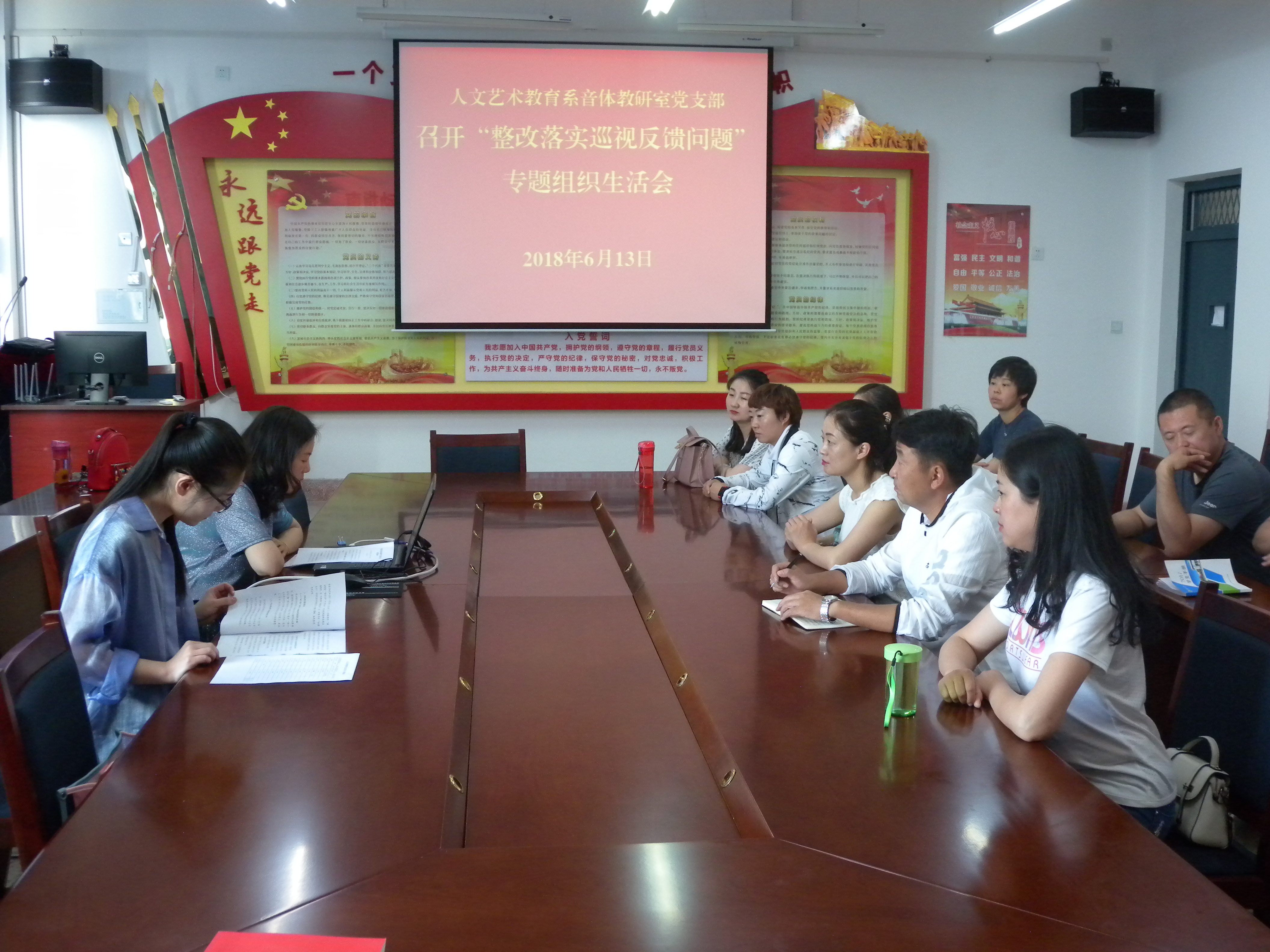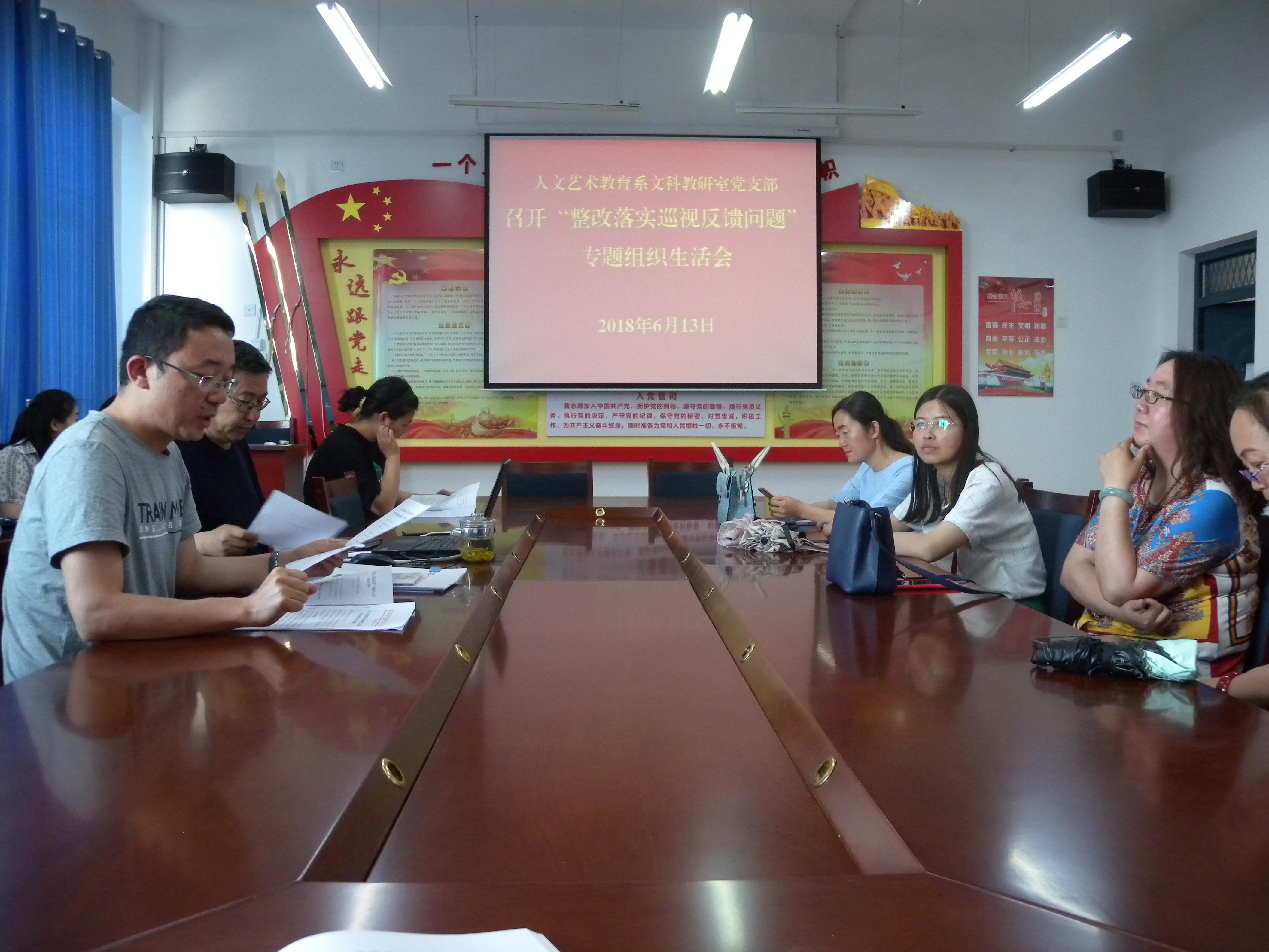 根據(jù)學(xué)院《關(guān)于以“整改落實(shí)巡視反饋問題”為主題召開專題組織生活會(huì)的通知》(武職院組函〔2018〕35號(hào))精神,6月13日,人文藝術(shù)教育系黨總支文科教研室黨支部和音體教研室黨支部在勵(lì)勤樓209黨員活動(dòng)室分別召開了以“整改落實(shí)巡視反饋問題”為主題的組織生活會(huì)。會(huì)議分別由支部書記主持,黨支部全體黨員參加。