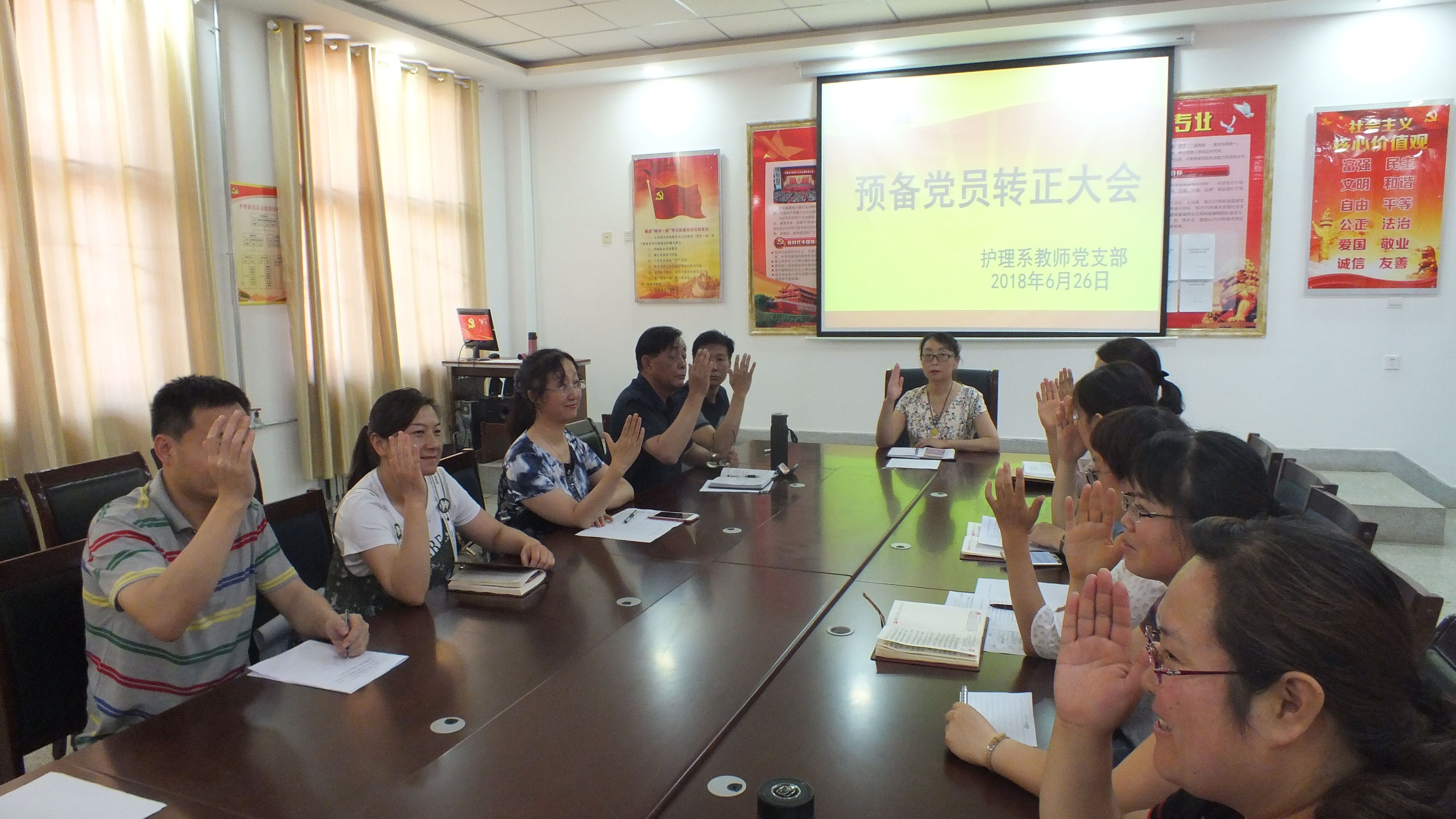 會(huì)議采取申請人暫時(shí)回避的方式進(jìn)行舉手投票,全票通過了預(yù)備黨員的轉(zhuǎn)正申請。最后,支部黨員在韓曉萍的帶領(lǐng)下,與新黨員一同宣讀入黨誓詞。
