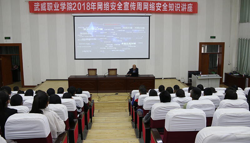 為深入學(xué)習(xí)宣傳貫徹習(xí)近平總書記在全國網(wǎng)絡(luò)安全和信息化工作會議上“深入開展網(wǎng)絡(luò)安全知識技能宣傳普及,提高廣大人民群眾網(wǎng)絡(luò)安全意識和防護(hù)技能”的重要講話精神,按照甘肅省教育廳、武威市網(wǎng)信辦關(guān)于開展2018年國家網(wǎng)絡(luò)安全宣傳周活動的要求。9月18日下午,學(xué)院在正德廳舉辦了“網(wǎng)絡(luò)安全與《網(wǎng)絡(luò)安全法》”的專題講座,師生代表200余人參加。