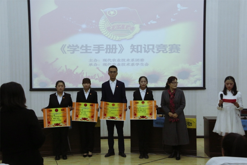 為切實(shí)貫徹學(xué)院教書(shū)育人、管理育人、服務(wù)育人的理念,營(yíng)造良好的校園文化氛圍,增強(qiáng)學(xué)生的自我教育、自我管理、自我服務(wù)、自我監(jiān)督的意識(shí)。10月18日,現(xiàn)代農(nóng)業(yè)技術(shù)系在正德廳舉辦了首屆學(xué)生手冊(cè)知識(shí)競(jìng)賽。本次活動(dòng)由系團(tuán)委舉辦,系學(xué)生會(huì)承辦,2018級(jí)各班選派3名隊(duì)員參加。系黨總支晏素珍、全體班主任觀看比賽。