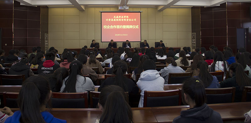 為提高人才培養(yǎng)質(zhì)量和辦學(xué)水平,加強(qiáng)校企協(xié)同育人機(jī)制建設(shè),2018年11月1日下午,藥學(xué)系與甘肅泰康制藥有限責(zé)任公司校企合作共建“就業(yè)實(shí)習(xí)基地”簽約揭牌儀式在行樹(shù)樓北側(cè)會(huì)議室隆重舉行。甘肅泰康制藥有限責(zé)任公司投資方—北京久朝集團(tuán)產(chǎn)業(yè)中心總監(jiān)楊宏超、公司總工程師毛著鴻、財(cái)務(wù)總監(jiān)郝敏等企業(yè)領(lǐng)導(dǎo)出席本次儀式。學(xué)院教務(wù)處處長(zhǎng)仲生仁、招生就業(yè)處處長(zhǎng)蔡柱山、藥學(xué)系主任魏潤(rùn)明、副主任楊建美、黨總支副書(shū)記單光年及藥學(xué)系160余名師生參加了此次簽約揭牌儀式。儀式由魏潤(rùn)明主持。