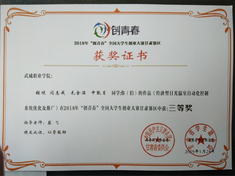 現(xiàn)代農(nóng)業(yè)技術(shù)系兩件作品獲得2018年“創(chuàng)青春”全國大學生創(chuàng)業(yè)大賽甘肅賽區(qū)三等獎