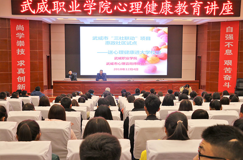 12月4日晚上,學生工作處聯(lián)合武威市“三社聯(lián)動”惠政社區(qū)試點項目在學院菁英廳舉辦了心理健康專題講座暨心理信息員培訓。此次講座邀請武威市心理咨詢師協(xié)會會長何飛老師主講,學院各系輔導員、2017級、2018級班級心理信息員、心翼心理社團會員等220多人聆聽了講座。學生工作處處長王守云主持活動。