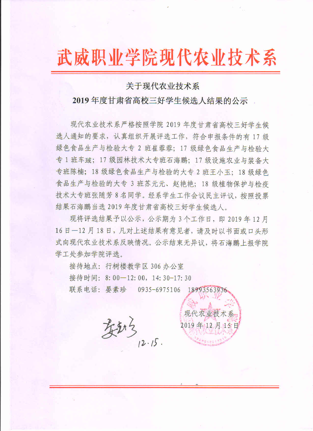 關于現(xiàn)代農(nóng)業(yè)技術系2019年度甘肅省高校三好學生候選人結果的公示
