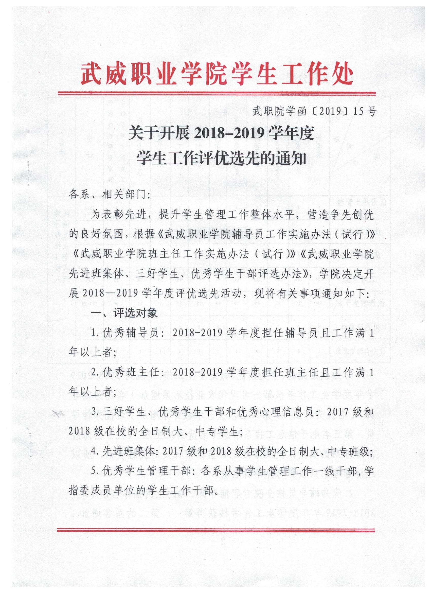 關(guān)于開展2018-2019學(xué)年度學(xué)生工作評優(yōu)選先的通知