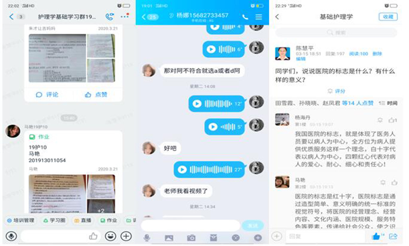 護理系通過“多平臺、多渠道”全面開展在線教學,主要采取“網(wǎng)絡課程+資料推送+討論答疑+互動直播”的線上教學模式。全系24名教師全部實施線上教學,課程共計11門次,已完成授課544學時(截至3月22日)。本周教師上傳課程課件93件,上傳視頻269個,根據(jù)教學任務布置課堂練習題數(shù)量為435,布置課后作業(yè)題目數(shù)量為857,本周內教師組織開展討論、答疑的總次數(shù)為89次,學生參與答疑討論的次數(shù)為16874次。學生平均到課率95%以上。從學院教學平臺反饋數(shù)據(jù)看,本周課程訪問量達到399415,位居全院第一。