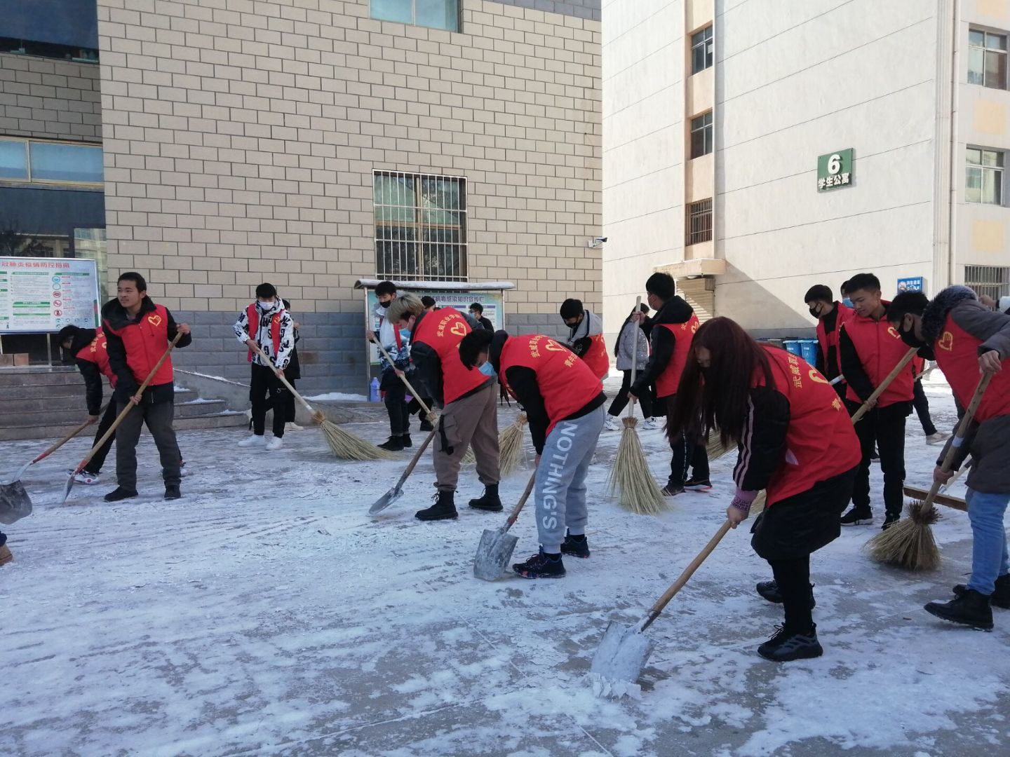 本次鏟雪的區(qū)域是教學(xué)樓區(qū)域的主干道和食堂門前道路。寒冷的天氣擋不住大家的勞動(dòng)熱情,厚厚的冰塊蓋不住大家的志愿精神。鐵鍬聲此起彼伏,大家分工明確,相互合作,現(xiàn)場氣氛熱烈。經(jīng)過多小時(shí)的勞動(dòng),大家將教學(xué)樓前主干道積雪基本清掃干凈。