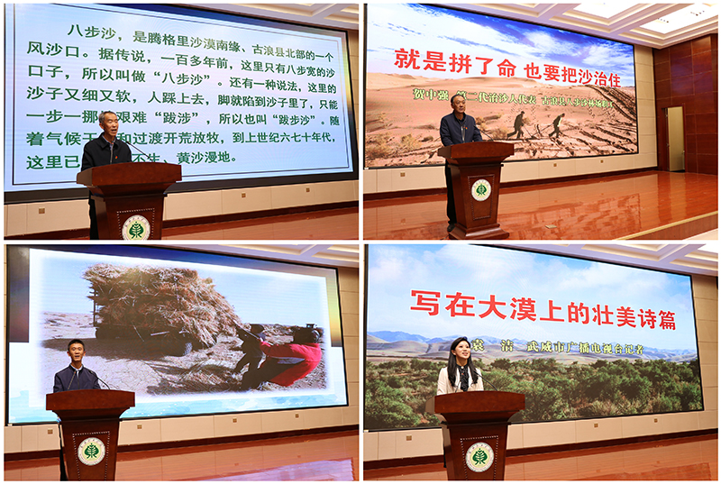 報(bào)告會(huì)上,二代治沙人代表、八步沙林場場長郭萬剛,二代治沙人代表、八步沙林場職工賀中強(qiáng),三代治沙人、八步沙林場管護(hù)員郭璽、武威市廣播電視臺記者袁潔,分別從綠色承諾、使命責(zé)任、接續(xù)奮斗、記者見證等不同角度、不同側(cè)面,生動(dòng)再現(xiàn)了“六老漢”三代人治沙造林持續(xù)改善生態(tài)環(huán)境、讓沙漠披綠生金的感人事跡。在場師生無不為“六老漢”三代人的感人事跡深深震撼,紛紛表示要學(xué)習(xí)和繼承“六老漢”三代人困難面前不低頭、敢把沙漠變綠洲的奮斗精神,為建設(shè)美麗中國、實(shí)現(xiàn)中華民族永續(xù)發(fā)展貢獻(xiàn)自己的青春力量。