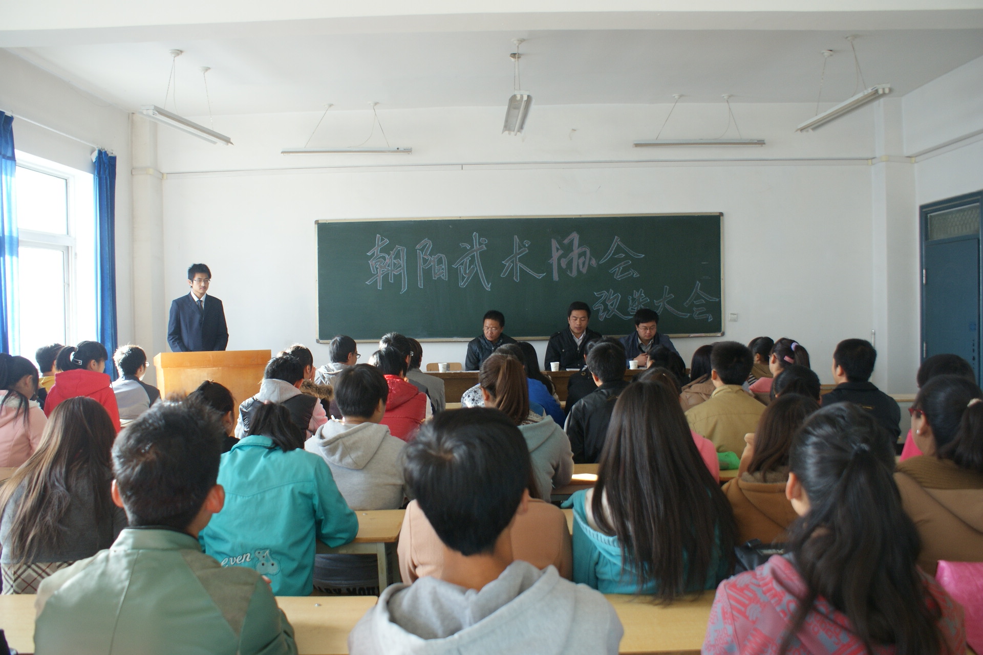 為了進一步構建校園和諧社團文化,加強武術協會的自身建設,不斷發(fā)展和完善武術協會的擴招力,激發(fā)優(yōu)秀青年學生參與協會建設的熱情,11日2日上午9時,由朝陽武術協會自主承辦的社團換屆大會在二號教學樓316教室如期舉行。