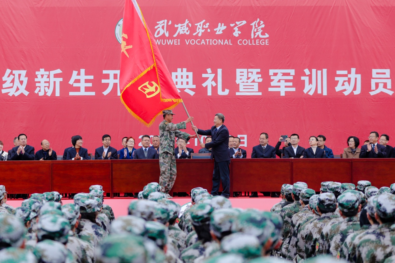 最后,趙明代表學(xué)院向軍訓(xùn)團(tuán)授旗,并宣布2021年新生軍訓(xùn)開始。