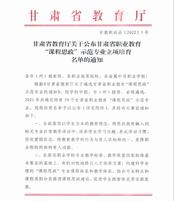 ? 近日,教育廳公布了2021年“技能甘肅”內涵項目評審結果,中科低碳新能源技術學院申報的甘肅省職業(yè)教育“課程思政”示范專業(yè)、甘肅省職業(yè)教育在線精品課程、甘肅省職業(yè)教育名師工作室均獲評。