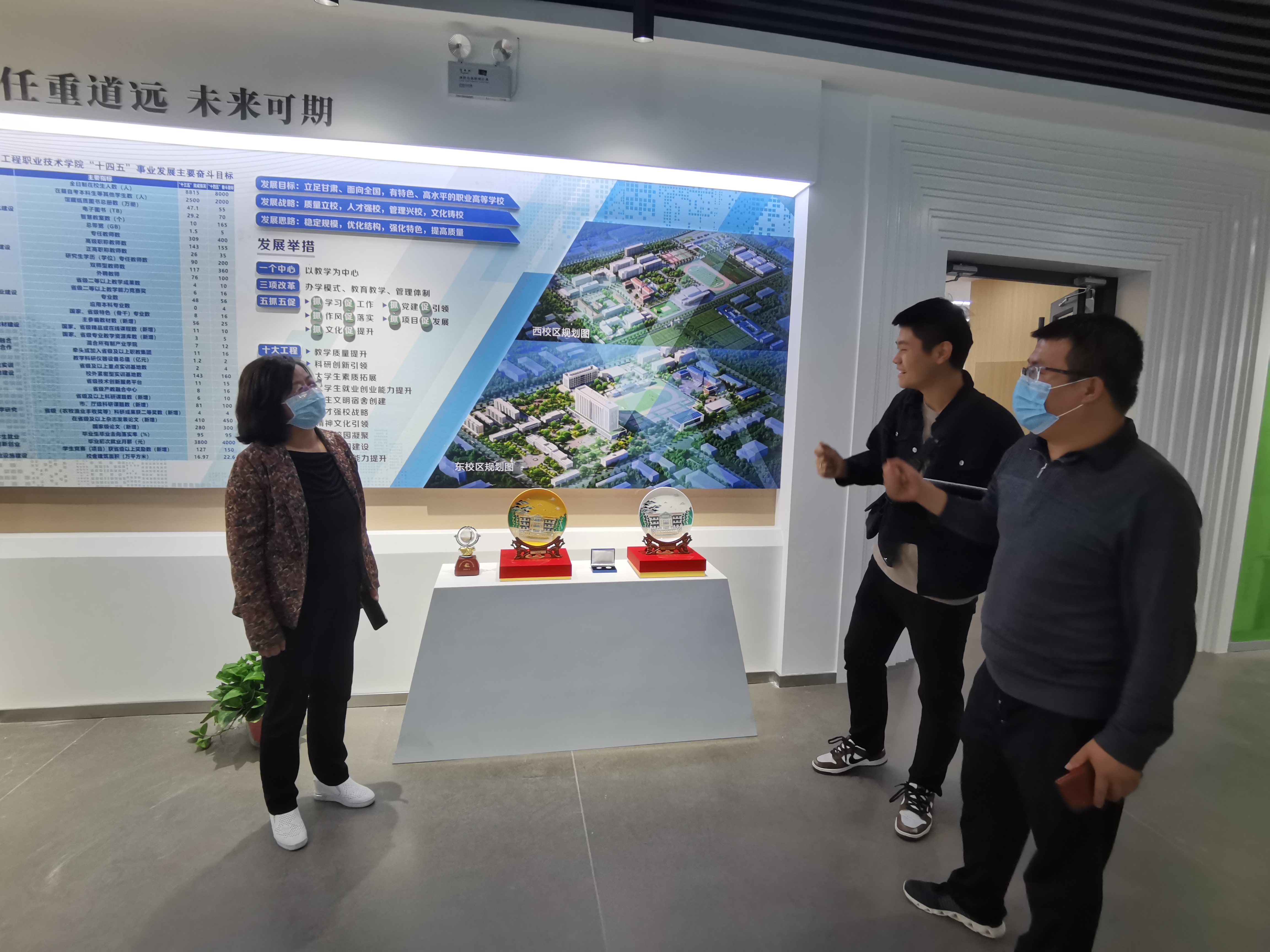 為全面推進“雙高計劃”學校建設(shè),提升圖書館服務(wù)水平,營造“書香校園”,將圖書館打造成人性化、智能化、專業(yè)化的綠色學習空間。近日,圖書館館長楊如松、副館長蔡濟眾、館員楊建盛三人到甘肅省畜牧工程職業(yè)技術(shù)學院圖書館考察學習,在甘肅省畜牧工程職業(yè)技術(shù)學院圖書館館長解玉寶陪同下,參觀了該校圖書館讀書吧、校史館、黨史館、“挑戰(zhàn)杯”獲獎作品展覽館等處,解玉寶講解了該館設(shè)計理念及建設(shè)過程中的側(cè)重點和展示重點。楊如松就現(xiàn)在圖書館裝發(fā)展趨勢、圖書館管理辦法、學生借閱量等實際問題同解玉寶進行了相互交流。