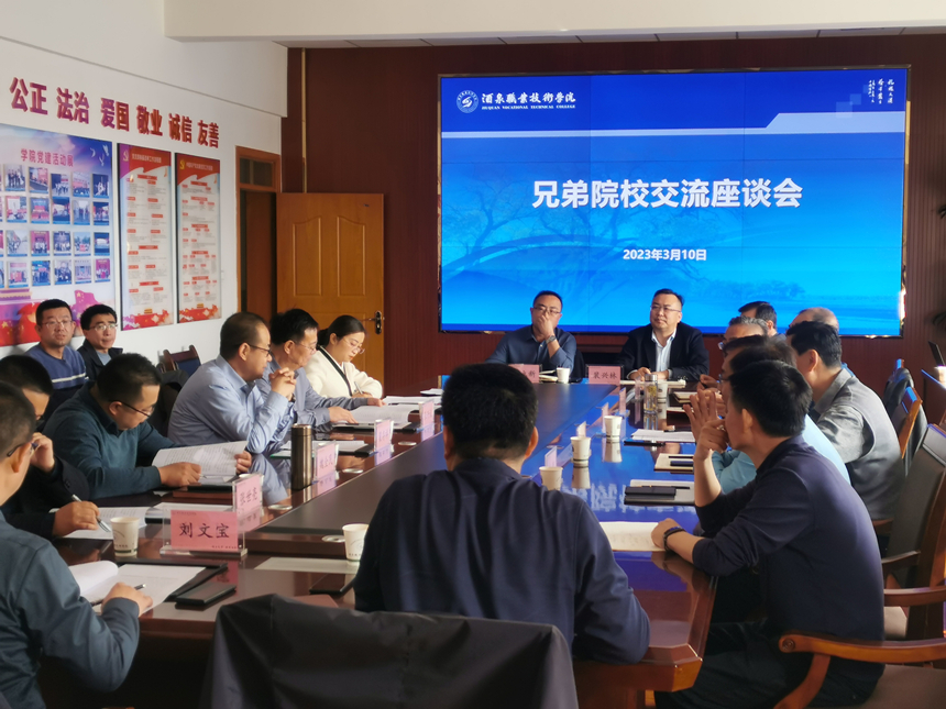 在行知樓會議室召開交流座談會。座談會上,許軍詳細(xì)介紹了酒泉職業(yè)技術(shù)學(xué)院發(fā)展的辦學(xué)特色、專業(yè)建設(shè)、“雙高計(jì)劃”項(xiàng)目建設(shè)和申辦本科層次職業(yè)技術(shù)大學(xué)等情況。翟存祥介紹了武威職業(yè)學(xué)院“雙高計(jì)劃”項(xiàng)目建設(shè)和申辦職業(yè)技術(shù)大學(xué)進(jìn)展。雙方就“雙高計(jì)劃”項(xiàng)目建設(shè)中遇到的堵點(diǎn)、痛點(diǎn)、難點(diǎn)問題和本科層次職業(yè)學(xué)校申辦、高水平專業(yè)群打造、“三教”改革、科研平臺搭建、社會服務(wù)能力提升、產(chǎn)業(yè)學(xué)院體制與管理、國際合作交流等工作進(jìn)行了深入探討交流。
