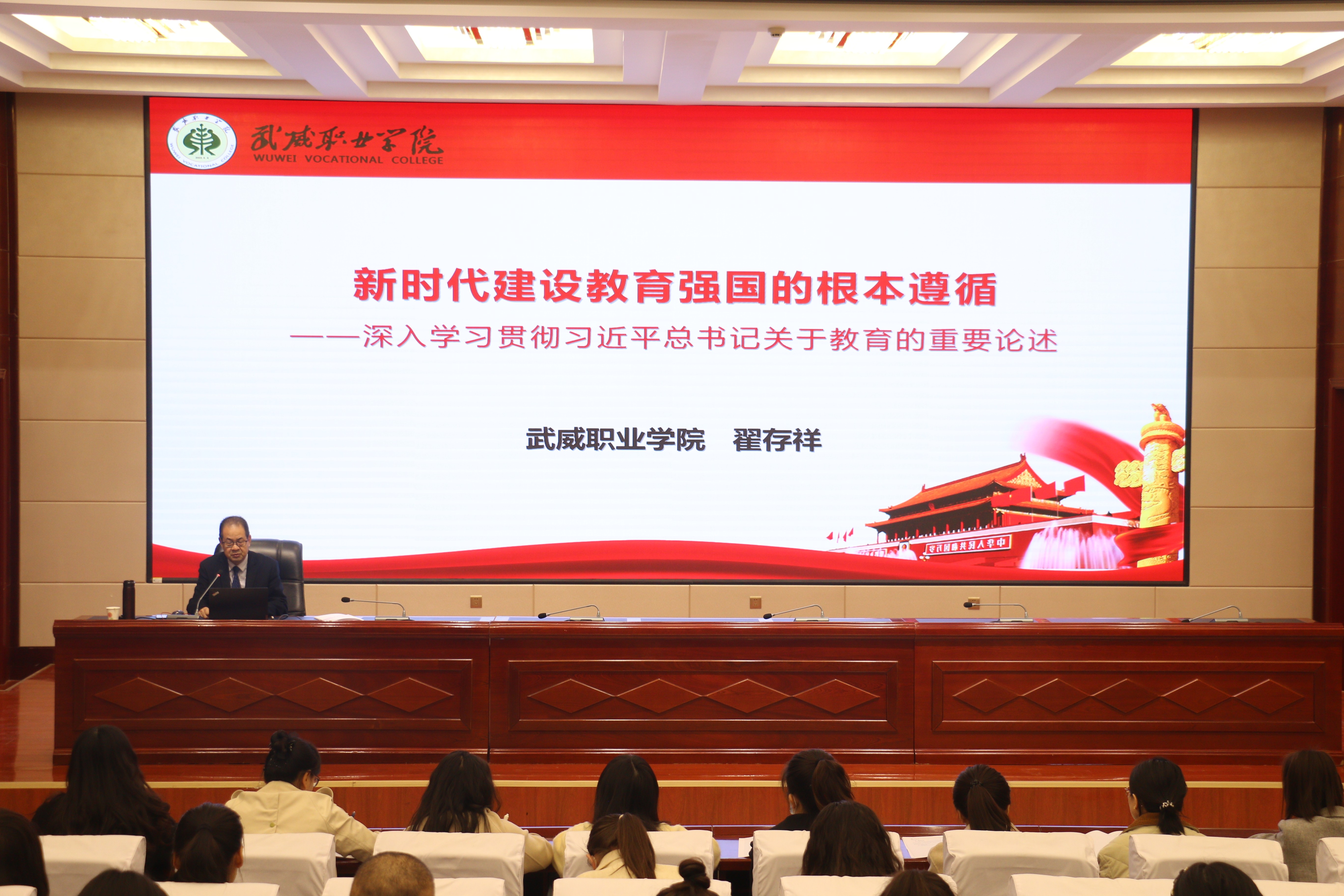翟存祥代表全體師生對113名新教師成為武威職業(yè)學(xué)院大家庭的一員表示熱烈歡迎,并介紹了舉辦此次培訓(xùn)班的目的。他指出,百年大計(jì),教育為本;教育大計(jì),教師為本;教師大計(jì),師德為本。作為新時(shí)代的教師,不要辜負(fù)習(xí)近平總書記“奮斗創(chuàng)造奇跡、力量源于團(tuán)結(jié)、希望寄予青年”的殷切希望。同時(shí),他要求新教師要搞清楚“我是誰,從哪里來,到哪里去”;搞清楚我要“干什么、如何干、為誰干”。盡快站穩(wěn)三尺講臺(tái),盡快融入職業(yè)教育,盡快融入這個(gè)大家庭,盡快成長為一名合格的、優(yōu)秀的人民教師,在教育教學(xué)崗位上立德立功立言。