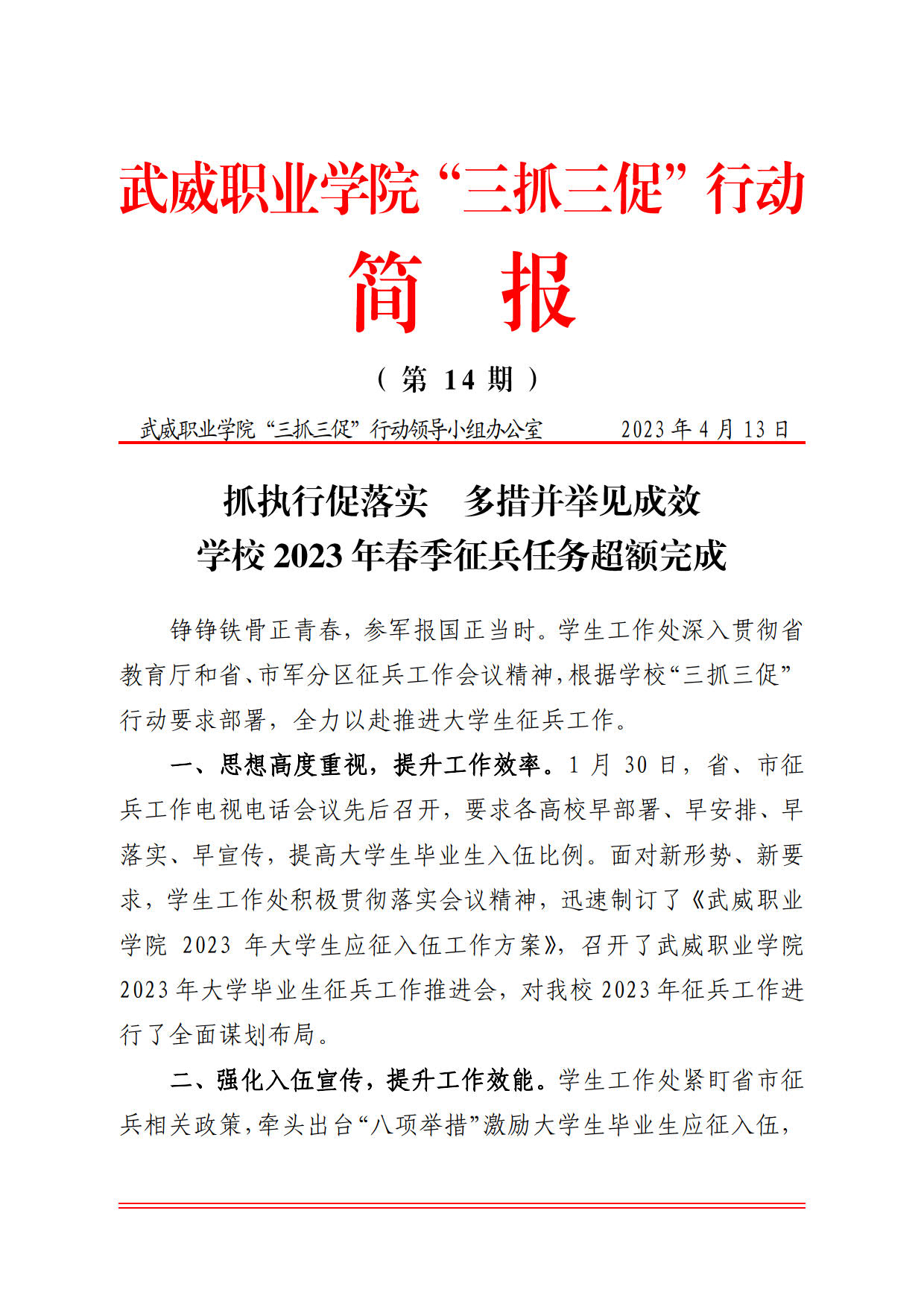 簡報第14期:抓執(zhí)行促落實 多措并舉見成效 學校2023年春季征兵任務超額完成