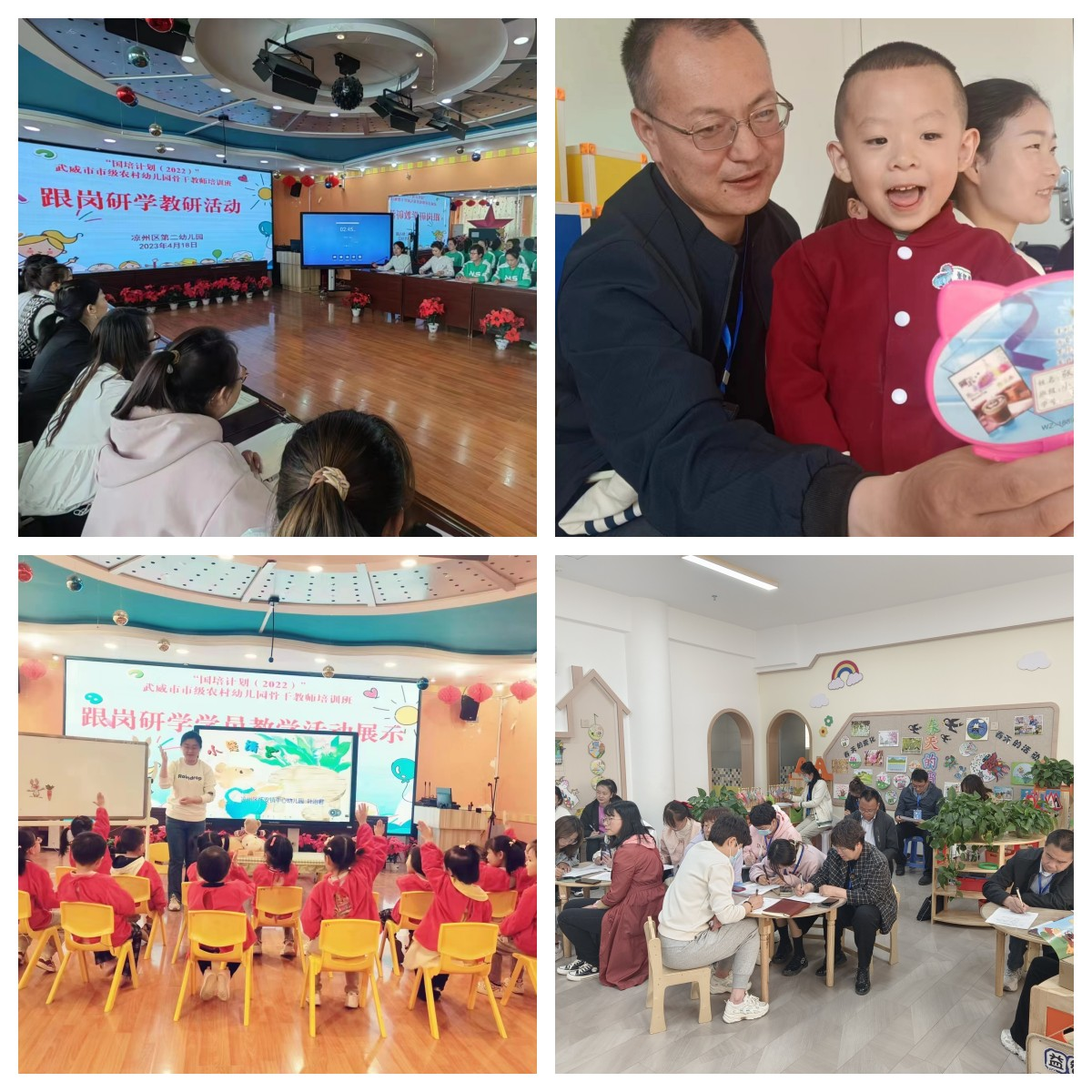 在跟崗研修期間,學(xué)員們分組進入武威市實驗幼兒園、武威市第二實驗幼兒園、涼州區(qū)第一、第二、第四幼兒園進行跟崗學(xué)習(xí)。走進幼兒園,感受優(yōu)美的園所環(huán)境和先進辦園理念,學(xué)習(xí)幼兒園班級建設(shè)、區(qū)角打造、環(huán)境布置、課程設(shè)置等。走進課堂,觀摩優(yōu)質(zhì)示范課,同課異構(gòu)課,體智能特色課,開展聽課、講課、評課、議課、研討交流活動,體驗先進的學(xué)前教育理念,增強了全體學(xué)員扎根學(xué)前教育的熱情和信念,開拓的學(xué)員眼界,提升了業(yè)務(wù)能力。4月21日,各幼兒園開展跟崗研修總結(jié)活動,導(dǎo)師學(xué)員談收獲,談體會,在團隊共進中內(nèi)化學(xué)習(xí)內(nèi)容。