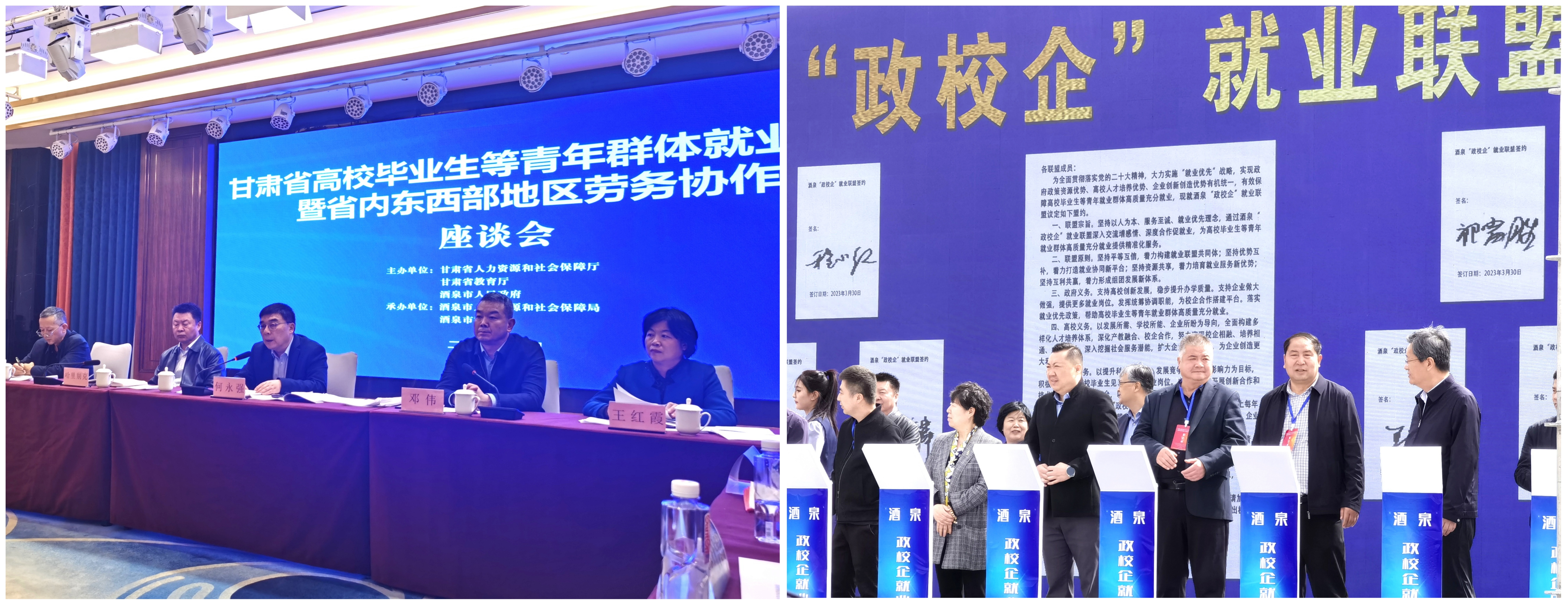 3月30日,王守云帶領(lǐng)招生就業(yè)處、合作教育辦負(fù)責(zé)人董鵬,在酒泉市參加了由甘肅省人社廳、教育廳組織舉辦的“甘肅省高校畢業(yè)生等青年群體就業(yè)暨省內(nèi)東西部地區(qū)勞務(wù)協(xié)作”座談會與招聘會,并進(jìn)行了政校企就業(yè)聯(lián)盟簽約活動。王守云代表武威職業(yè)學(xué)院在會上做了題為“政校企聯(lián)動深化校企合作,促進(jìn)畢業(yè)生高質(zhì)量充分就業(yè)”的交流發(fā)言。