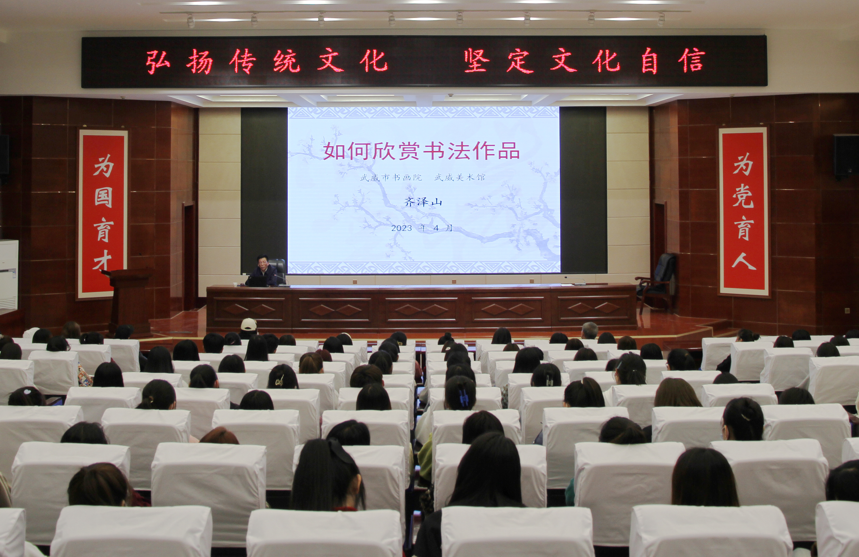 為進(jìn)一步學(xué)習(xí)宣傳貫徹黨的二十大精神,推動(dòng)學(xué)習(xí)貫徹習(xí)近平新時(shí)代中國特色社會(huì)主義思想主題教育走深走實(shí),深入開展“三抓三促”行動(dòng),弘揚(yáng)中華優(yōu)秀傳統(tǒng)文化,4月21日,學(xué)校邀請(qǐng)武威市書畫院(武威美術(shù)館)院長齊澤山一行7人來我校開展傳統(tǒng)文化進(jìn)校園活動(dòng)。學(xué)校黨委書記、校長趙明,副校長王守云出席活動(dòng)。學(xué)校中國傳統(tǒng)文化體驗(yàn)中心團(tuán)隊(duì)教師、藝術(shù)與教育學(xué)院師生、志通書法協(xié)會(huì)全體會(huì)員、外國留學(xué)生等,共計(jì)200余人參加本次活動(dòng)。