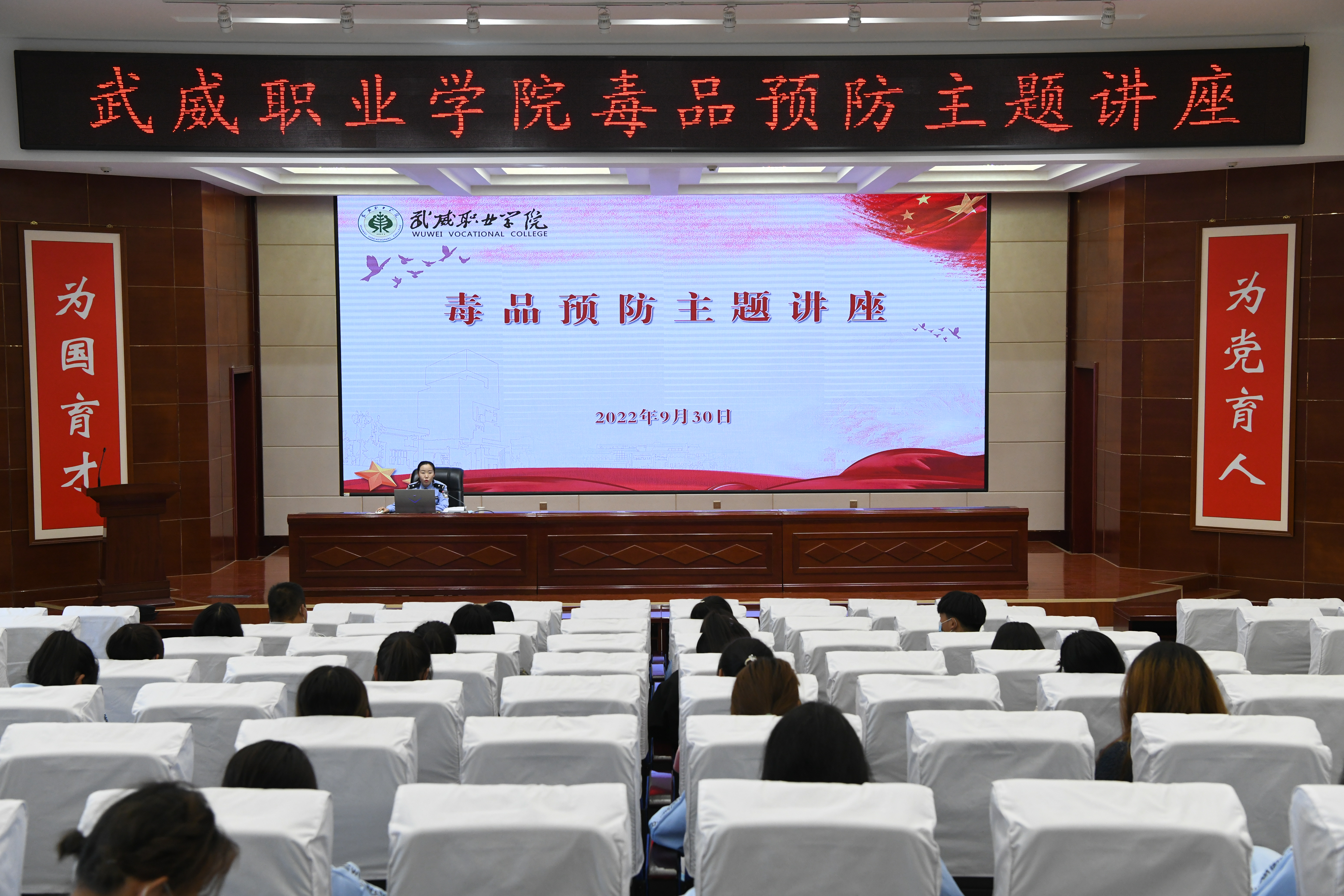 為進(jìn)一步加強(qiáng)學(xué)校毒品預(yù)防教育工作,不斷提高師生識(shí)毒、防毒、拒毒意識(shí),9月30日,學(xué)校安全保衛(wèi)處邀請(qǐng)武威市公安局涼州分局西關(guān)派出所民警王敏同志在學(xué)生發(fā)展中心菁英廳開展“健康人生 綠色無(wú)毒”預(yù)防毒品主題講座,各二級(jí)學(xué)院師生代表聆聽了講座,講座由安全保衛(wèi)處負(fù)責(zé)人李欣主持。