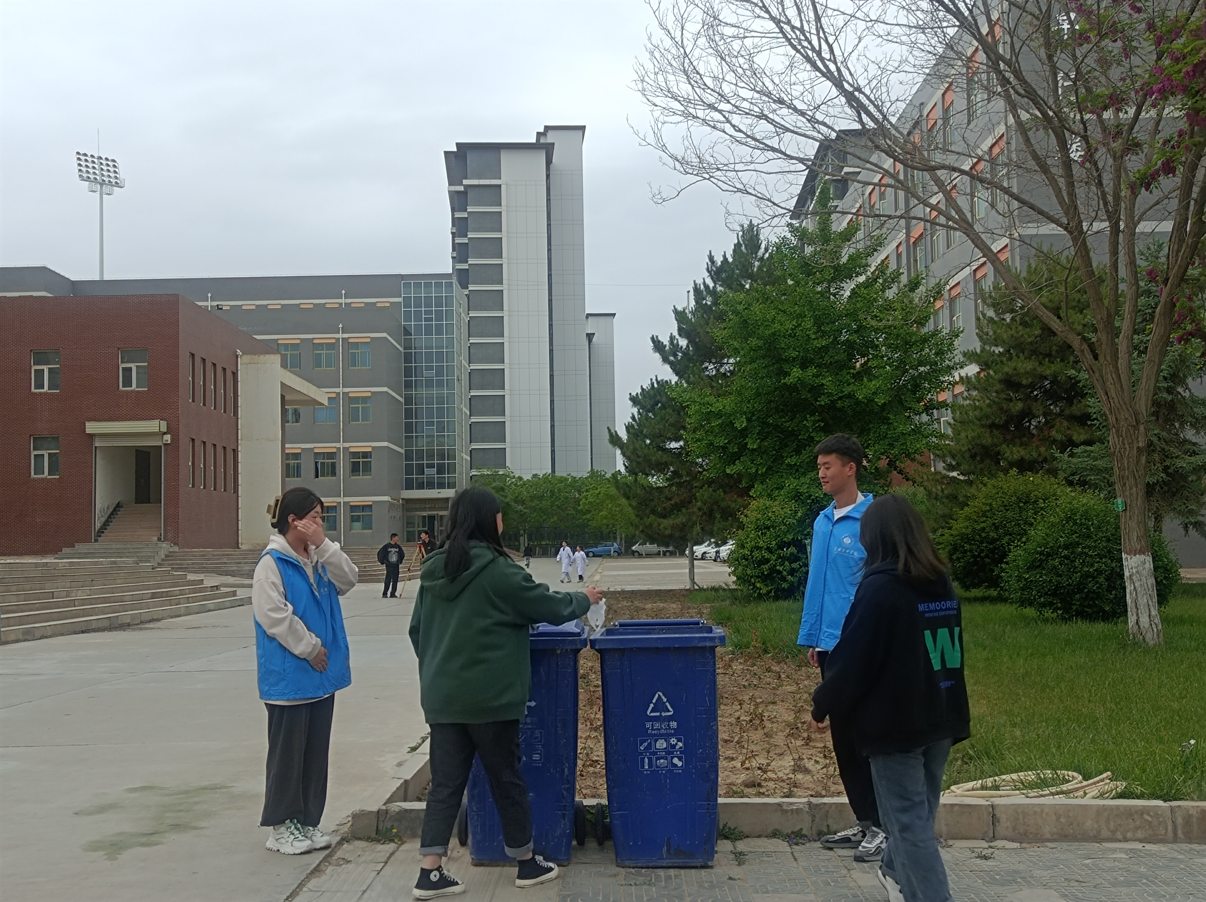 ? ? ? 志愿者們 積極參與生活垃圾分類宣傳,傳播“生態(tài)文明,從我做起"的生活理念,主動做垃圾分類知識的宣傳者、文明生活理念的倡導(dǎo)者、垃圾分類收集的志愿者,以實際行動帶動身邊人參與生活垃圾分類和勞動實踐中來。積極參加學(xué)校垃圾分類工作,從自身做起、從現(xiàn)在做起,正確分類垃圾,主動糾正錯誤的垃圾分類習(xí)慣,自覺將學(xué)習(xí)、工作、生活過程中產(chǎn)生的垃圾進(jìn)行分類收集和投放,不隨意丟棄。志愿者積極的奔走在校園每一個角落,引導(dǎo)同學(xué)們做好垃圾分類,為同學(xué)們樹立起垃圾分類的意識。