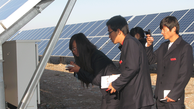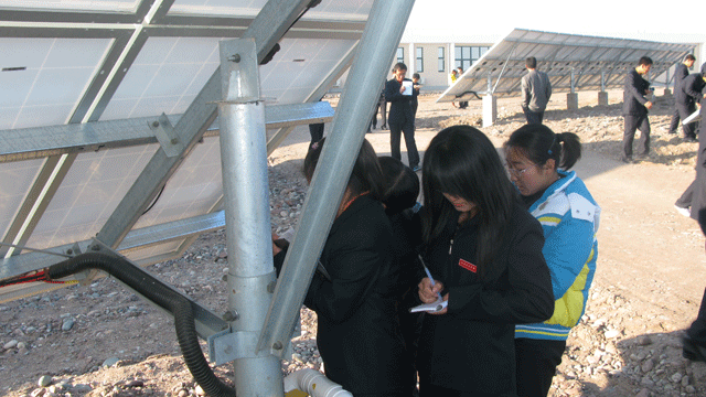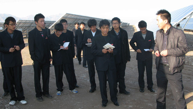在觀摩學(xué)習(xí)過程中,全體師生受到了園區(qū)管委會(huì)工作人員的熱情接待,管委會(huì)張國(guó)偉主任帶領(lǐng)師生參觀了中節(jié)能甘肅武威太陽(yáng)能發(fā)電有限公司,公司負(fù)責(zé)人向大家介紹了園區(qū)建設(shè)情況,從多晶硅、單晶硅的提煉、太陽(yáng)能電池板的生產(chǎn)制造到光伏電站的建設(shè),對(duì)光伏發(fā)電產(chǎn)業(yè)鏈進(jìn)行了較詳盡的講述。同學(xué)們看到園區(qū)內(nèi)一排排整齊擺置的太陽(yáng)能電池板方陣時(shí),都流露出激動(dòng)崇敬的神情,一個(gè)個(gè)邊走邊看,并伸手觸摸太陽(yáng)能電池板。同學(xué)們就光伏發(fā)電的原理、電池使用壽命、光電轉(zhuǎn)換效率以及光伏電站的運(yùn)行維護(hù)等方面的專業(yè)知識(shí)向負(fù)責(zé)人請(qǐng)教,面對(duì)大家的疑問,園區(qū)負(fù)責(zé)人都耐心細(xì)致的做了解答。