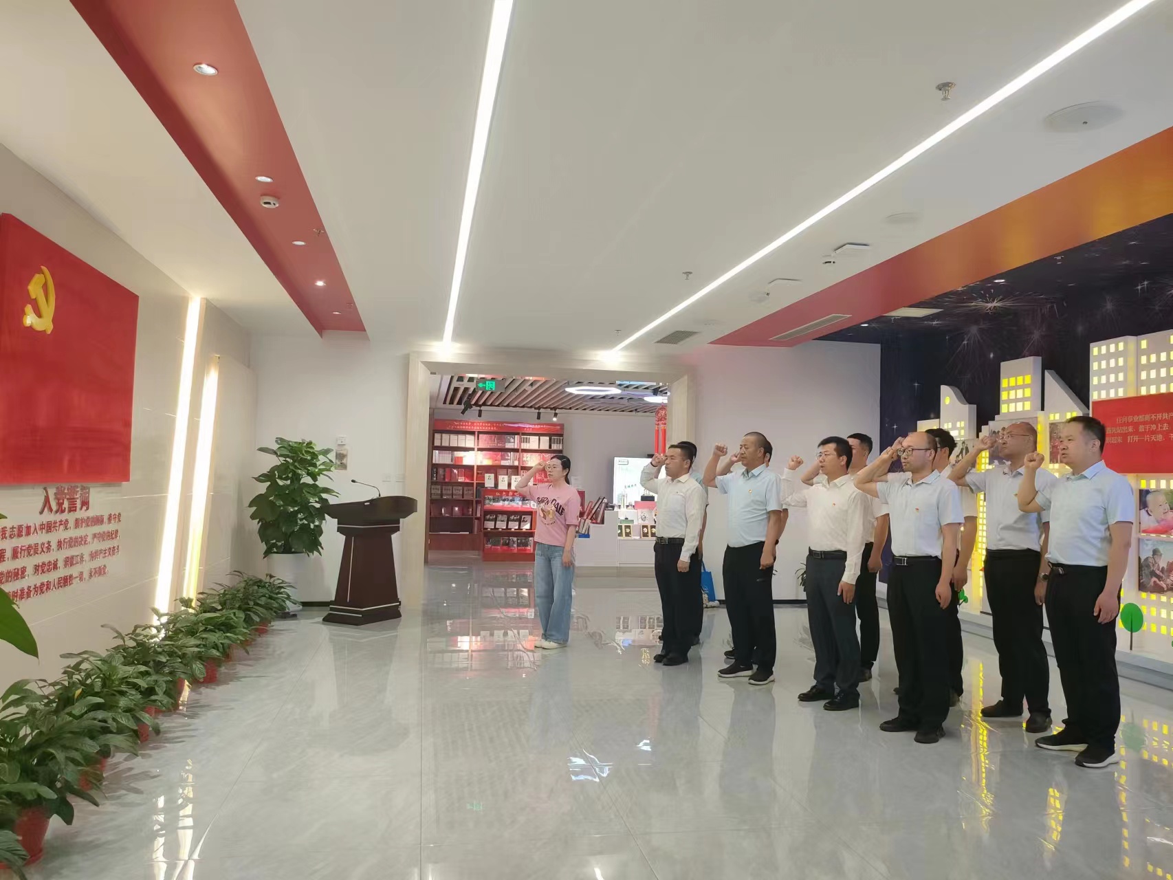 參觀結(jié)束后,在鮮紅的黨旗下,全體黨員舉起右拳,重溫入黨誓詞。一句句鏗鏘的誓言、一個(gè)個(gè)緊握的拳頭、一枚枚閃亮的黨徽,深情表達(dá)著對(duì)黨的無(wú)限熱愛(ài)和聽(tīng)黨話、感黨恩的決心。