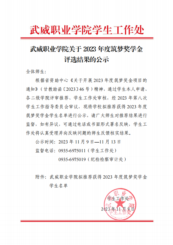 武威職業(yè)學(xué)院關(guān)于2023年度筑夢(mèng)獎(jiǎng)學(xué)金評(píng)選結(jié)果的公示