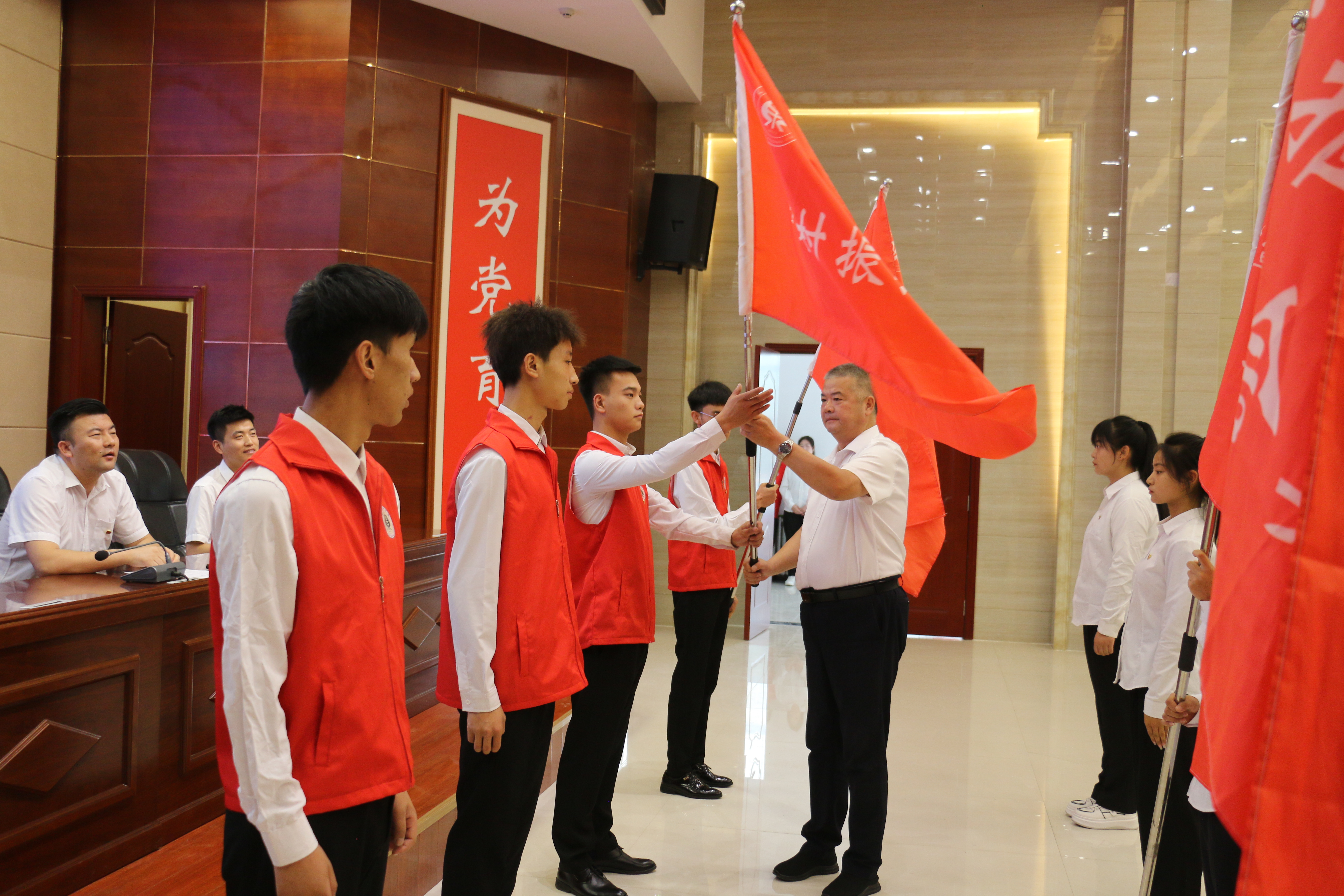 王守云為各實(shí)踐服務(wù)團(tuán)隊(duì)授旗。志愿者代表候昊燁代表全體隊(duì)員莊嚴(yán)承諾,遵守紀(jì)律,克服困難,團(tuán)結(jié)協(xié)作,全力以赴,力爭圓滿地完成預(yù)定的各項(xiàng)實(shí)踐任務(wù)。指導(dǎo)教師代表姚盈老師發(fā)言,介紹了“直播帶貨-非遺傳承”鄉(xiāng)村振興促進(jìn)團(tuán)的實(shí)踐計劃情況,號召老師和同學(xué)們深入基層一線,用腳步丈量祖國大地,用眼睛發(fā)現(xiàn)中國精神,用耳朵傾聽人民呼聲,用內(nèi)心感應(yīng)時代脈搏。