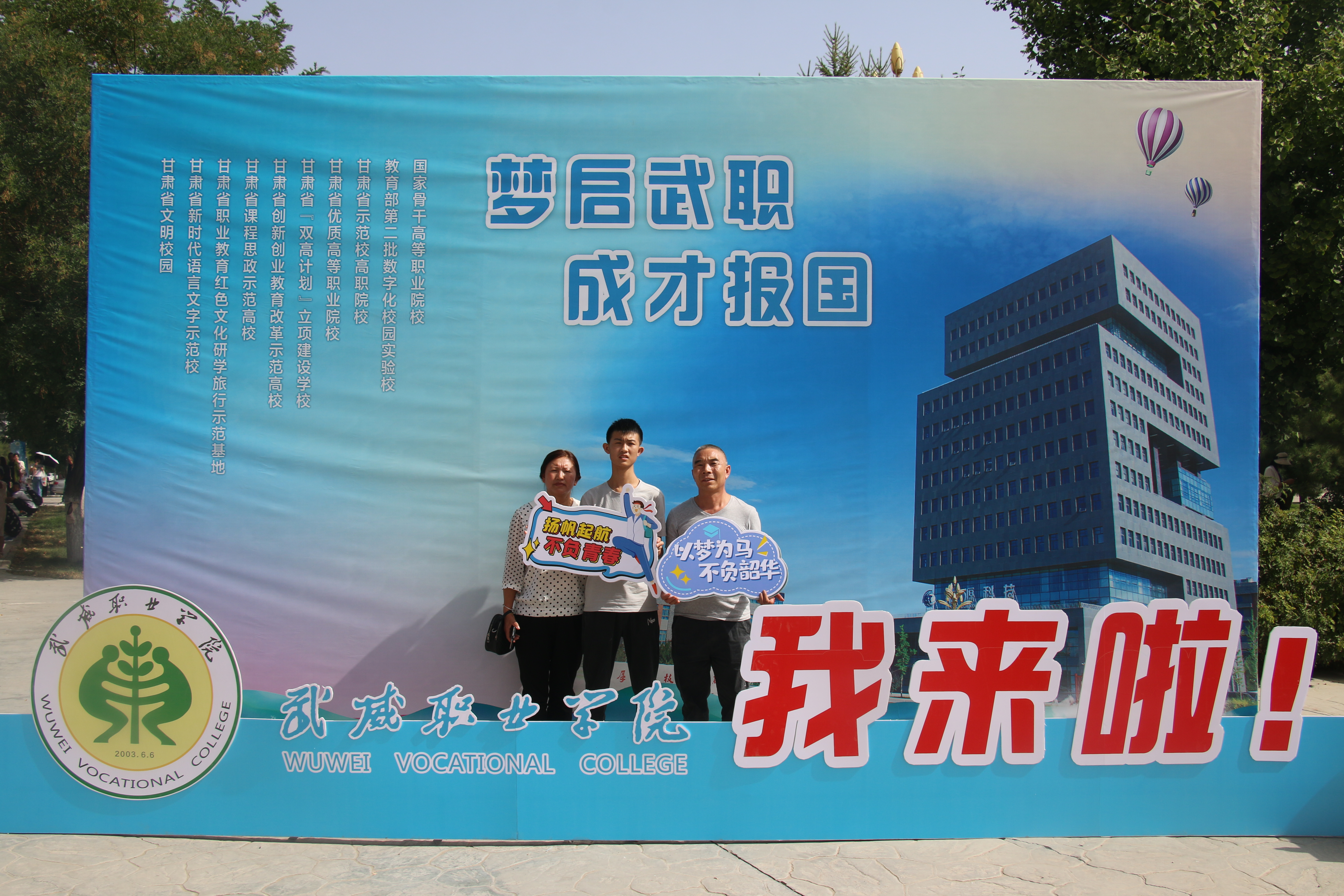 新同學滿懷期盼和憧憬與校門合個影,