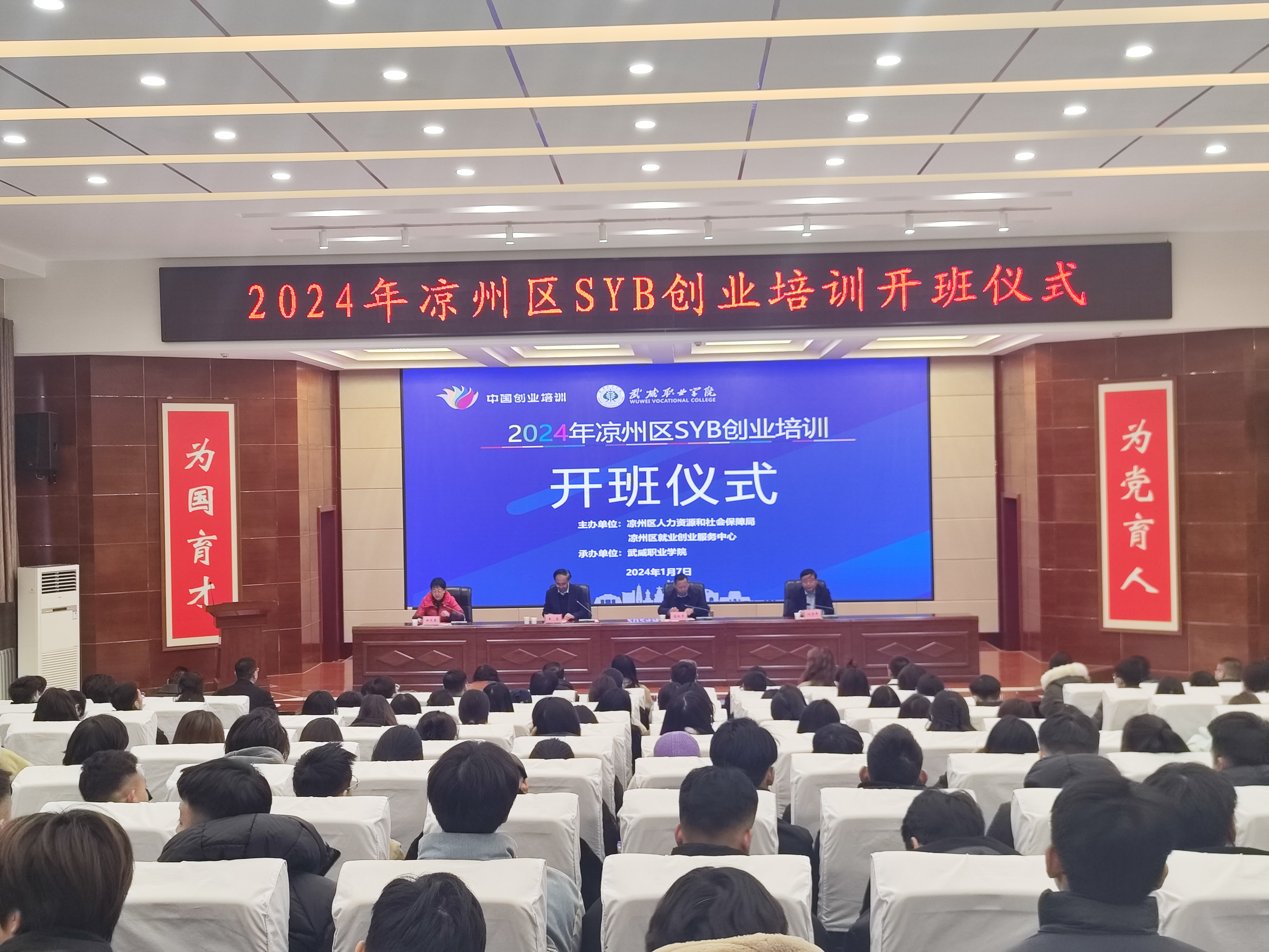 1月7日上午,由涼州區(qū)人社局、涼州區(qū)就業(yè)創(chuàng)業(yè)服務(wù)中心主辦,我校承辦的2024年涼州區(qū)SYB創(chuàng)業(yè)培訓(xùn)開(kāi)班式在菁英廳舉行,學(xué)校黨委書(shū)記王宏,涼州區(qū)人社局黨組書(shū)記、局長(zhǎng)藺銀平,涼州區(qū)人社局黨組成員、區(qū)就業(yè)創(chuàng)業(yè)服務(wù)中心主任劉學(xué)年,學(xué)校繼續(xù)教育學(xué)院、創(chuàng)新創(chuàng)業(yè)中心負(fù)責(zé)同志參加開(kāi)班式,學(xué)校黨委委員、副校長(zhǎng)田迎春主持開(kāi)班式。培訓(xùn)講師代表,培訓(xùn)班班主任,培訓(xùn)學(xué)員代表等200余人參加了開(kāi)班式。
