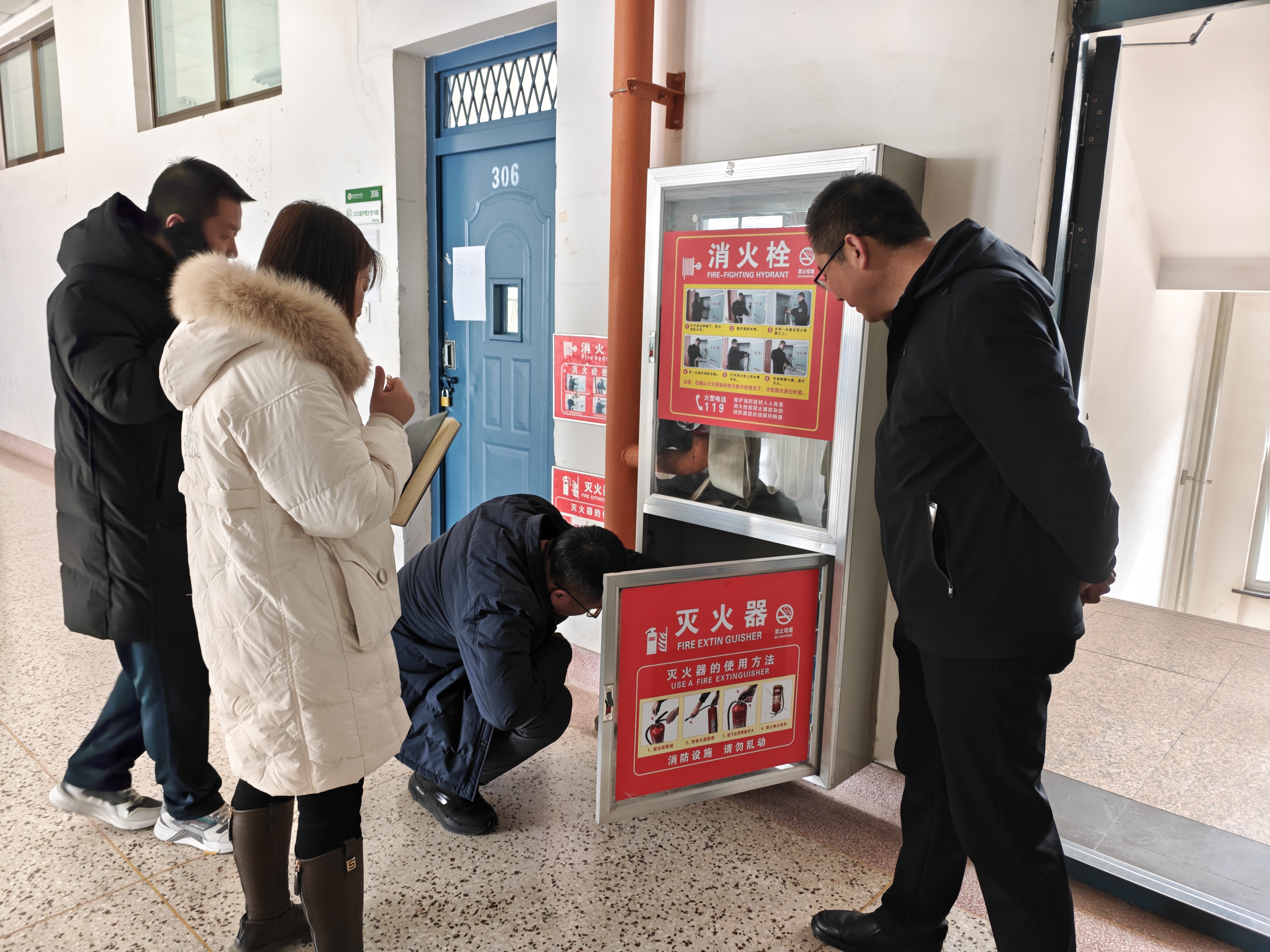 在實(shí)驗(yàn)實(shí)訓(xùn)室內(nèi),督察組詢問(wèn)設(shè)施設(shè)備準(zhǔn)備情況,逐一檢查實(shí)訓(xùn)場(chǎng)地內(nèi)消防安全設(shè)施配備情況。