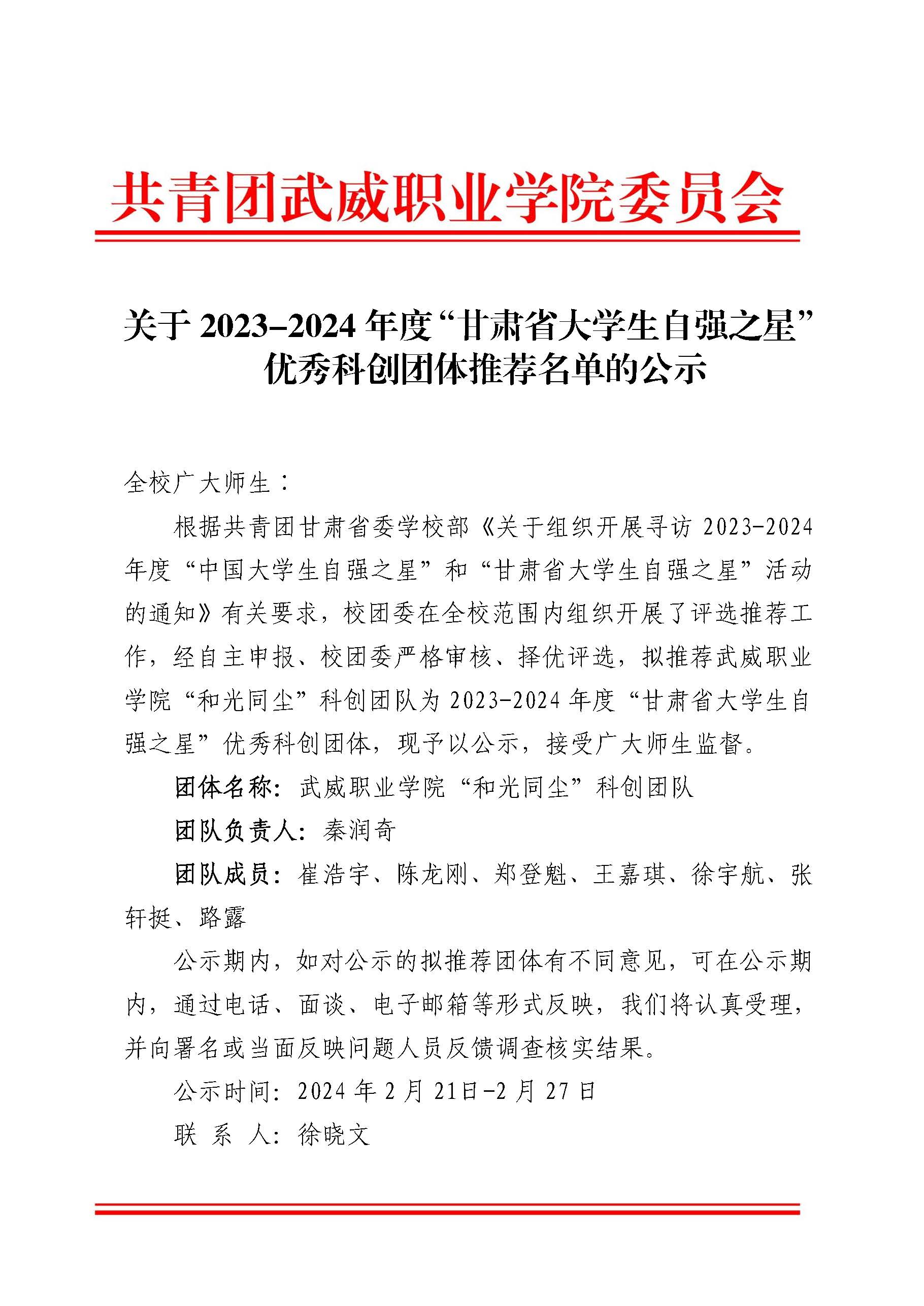 關于2023-2024年度“甘肅省大學生自強之星”優(yōu)秀科創(chuàng)團體推薦名單的公示