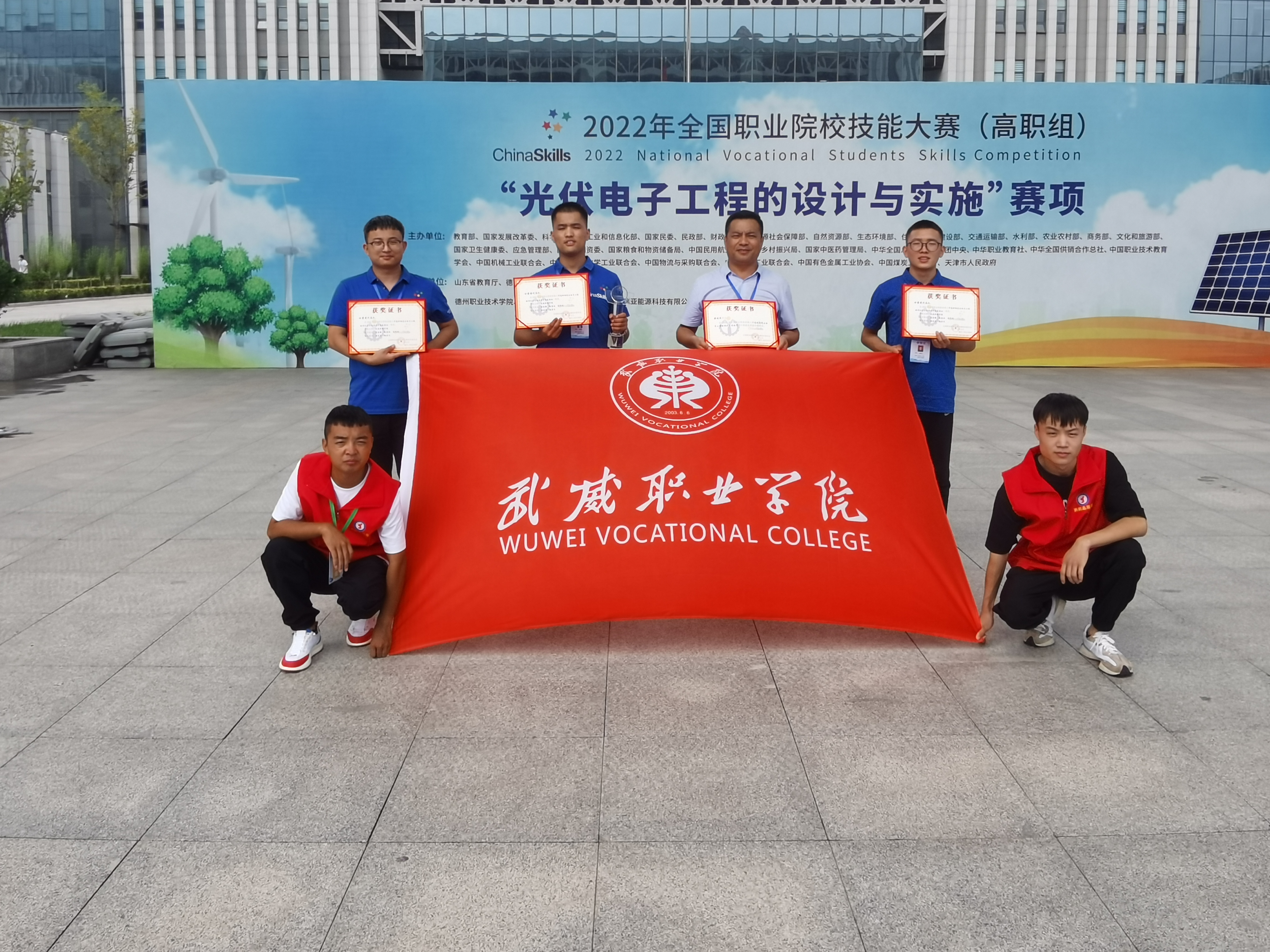 8月22日至23日,由教育部、工業(yè)和信息化部、財政部、人力資源和社會保障部、住房和城鄉(xiāng)建設(shè)部、交通運輸部、農(nóng)業(yè)部等部委主辦的2022年全國職業(yè)院校技能大賽高職組“光伏電子工程的設(shè)計與實施”賽項在山東德州職業(yè)技術(shù)學院舉辦,來自全國30個省(市)、自治區(qū)的55支代表隊參加了比賽。武威職業(yè)學院中科低碳新能源技術(shù)學院高東興、富金強、趙寶林三名同學代表甘肅省參加本次大賽,最終榮獲國賽一等獎,完全實現(xiàn)了賽前確定的“穩(wěn)二爭一”的目標任務(wù)。這是學校參加全國職業(yè)院校技能大賽以來首次獲得國賽一等獎,實現(xiàn)了學校該賽項國獎“零”的突破,開啟了學校專業(yè)建設(shè)高質(zhì)量發(fā)展新征程。本次優(yōu)異成績的取得充分展現(xiàn)了學?!皪徴n賽證”相融通的綜合育人效果,充分體現(xiàn)了學校深化“三教改革”推動高質(zhì)量發(fā)展的成效,充分彰顯了學校實施“雙高計劃”“技能甘肅”“提質(zhì)培優(yōu)”等重大項目建設(shè)推進高水平發(fā)展的成效,本次競賽成績是對學校新能源類專業(yè)建設(shè)的肯定,也是武威乃至全省職業(yè)教育發(fā)展的試金石和榮光。