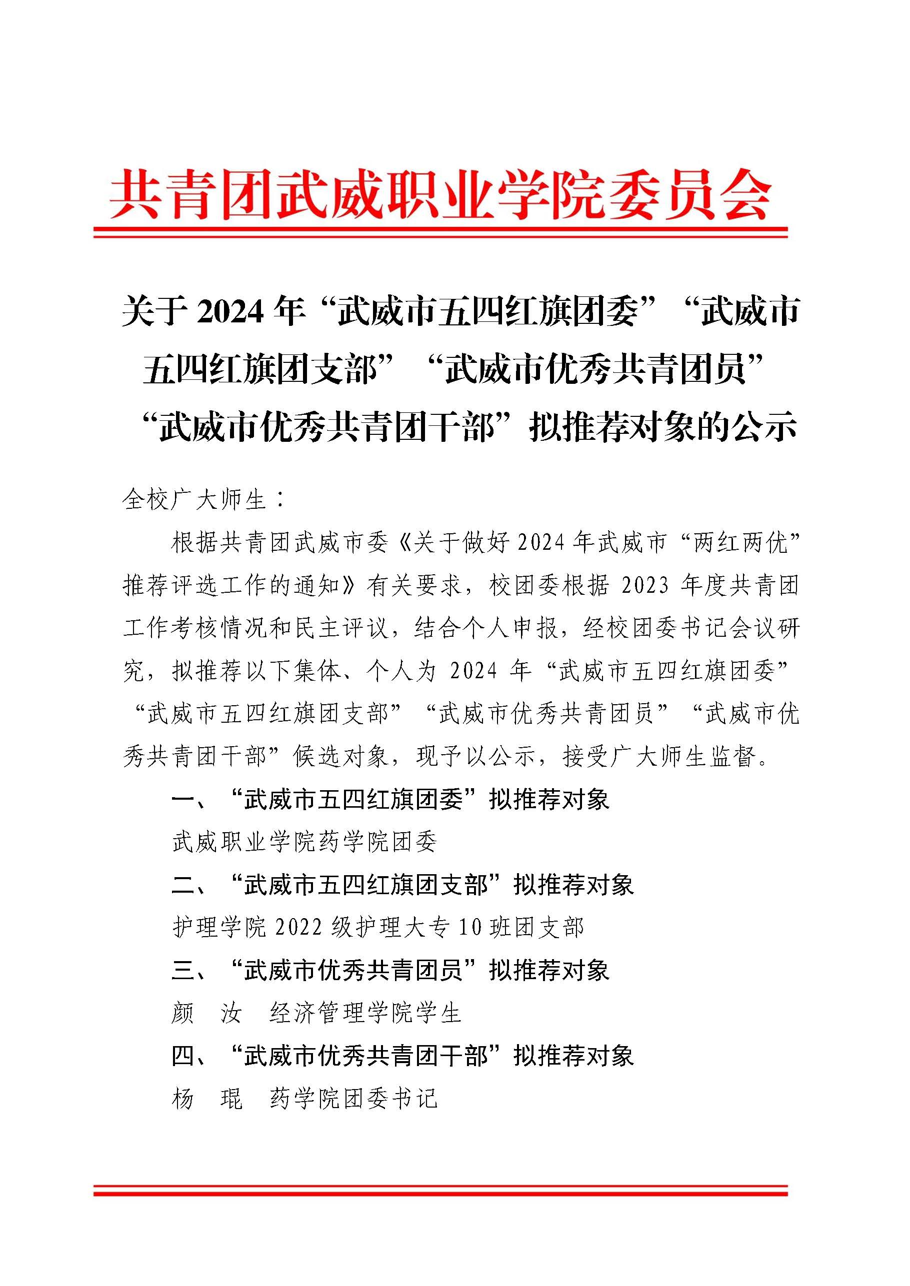關(guān)于2024年“武威青年五四獎?wù)隆啊毙聲r代武威好青年“擬推薦對象的公示