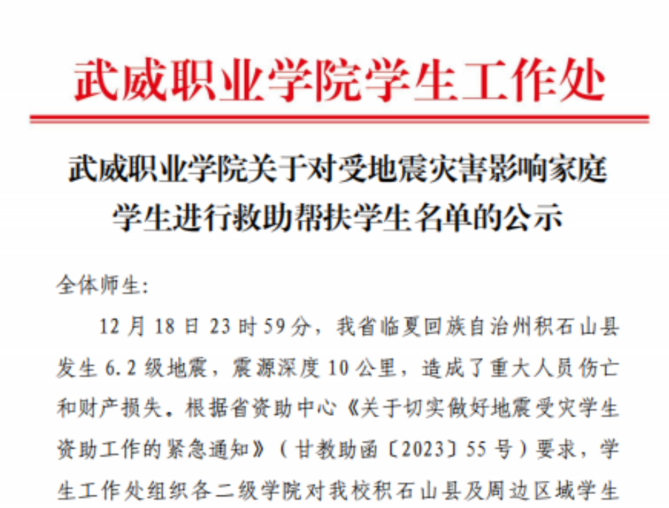 12月18日23時59分,我省臨夏回族自治州積石山縣發(fā)生6.2級地震。地震發(fā)生后,學校高度重視災(zāi)區(qū)學生家庭受災(zāi)情況,密切關(guān)注各項災(zāi)情的發(fā)展變化,第一時間對積石山縣及周邊區(qū)域地震受災(zāi)家庭學生情況進行摸排,迅速啟動救助幫扶關(guān)愛工作。