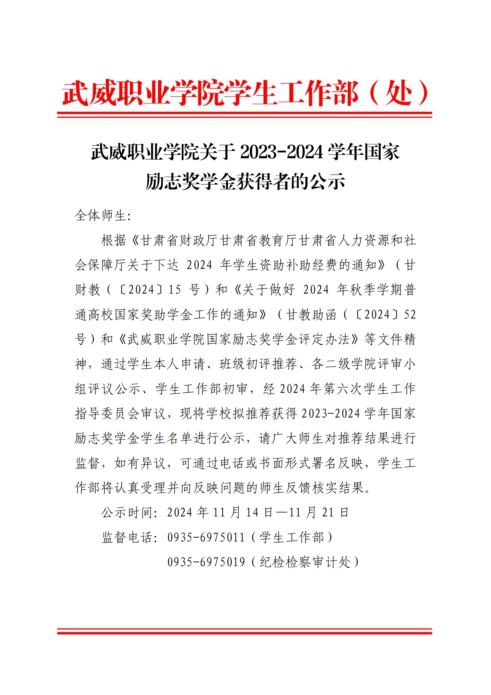 武威職業(yè)學(xué)院關(guān)于2023-2024學(xué)年國(guó)家勵(lì)志獎(jiǎng)學(xué)金候選人的公示