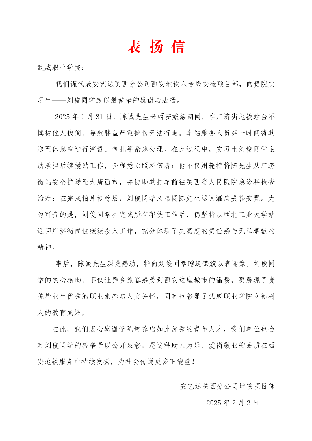 實(shí)習(xí)單位安藝達(dá)陜西分公司地鐵項(xiàng)目部在表?yè)P(yáng)信中特別指出:“劉俊同學(xué)在突發(fā)事件中表現(xiàn)出的應(yīng)急處理能力、人文關(guān)懷意識(shí)及高度的責(zé)任感,正是新時(shí)代地鐵服務(wù)者應(yīng)有的職業(yè)風(fēng)范。”