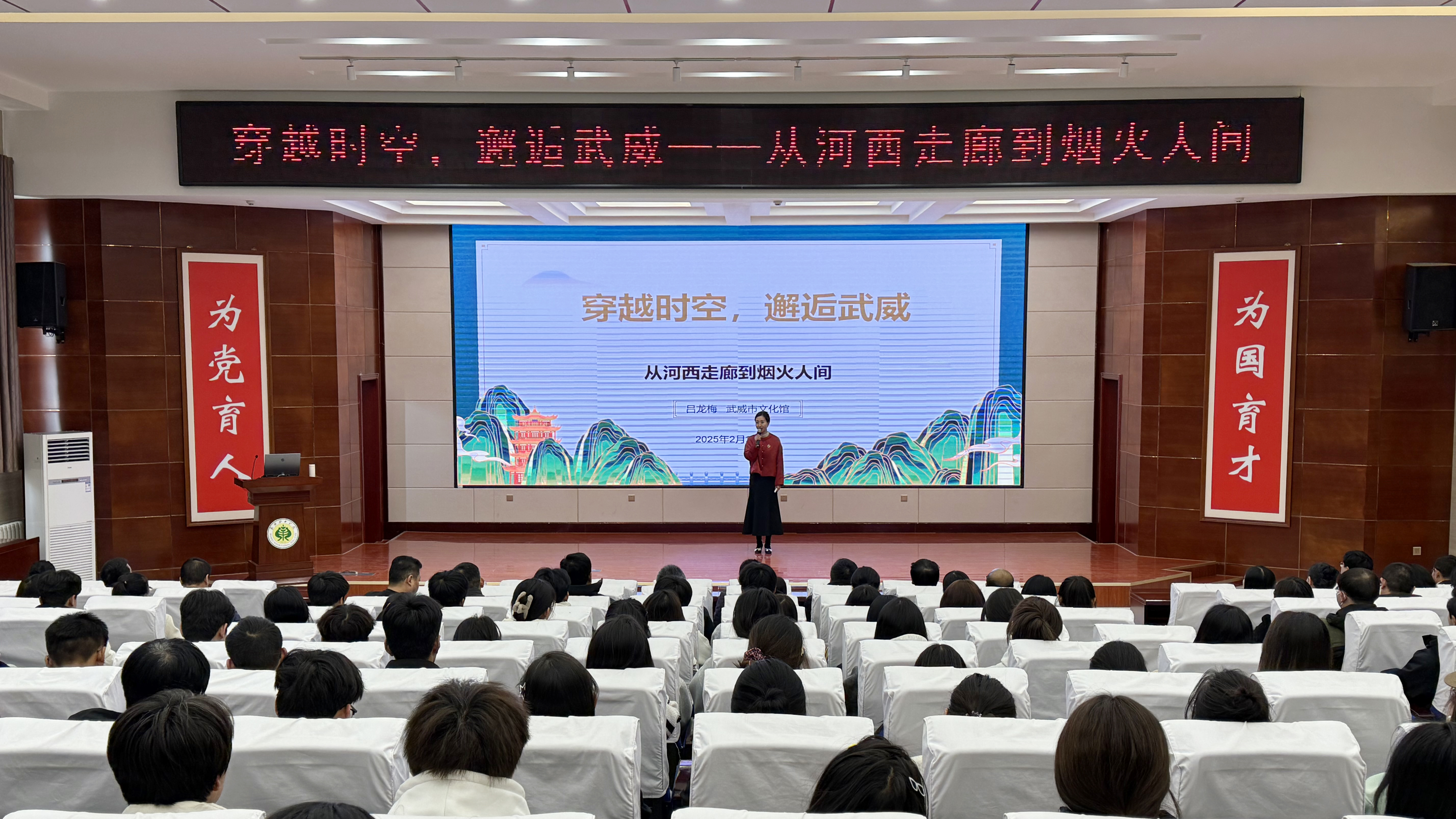 2月28日,校團委特邀甘肅省優(yōu)秀青年文化人才、武威市文化館館長呂龍梅,在學校菁英廳為師生作了題為《穿越時空,邂逅武威——從河西走廊到煙火人間》的專題講座,學校師生代表共計200余人參加了活動。