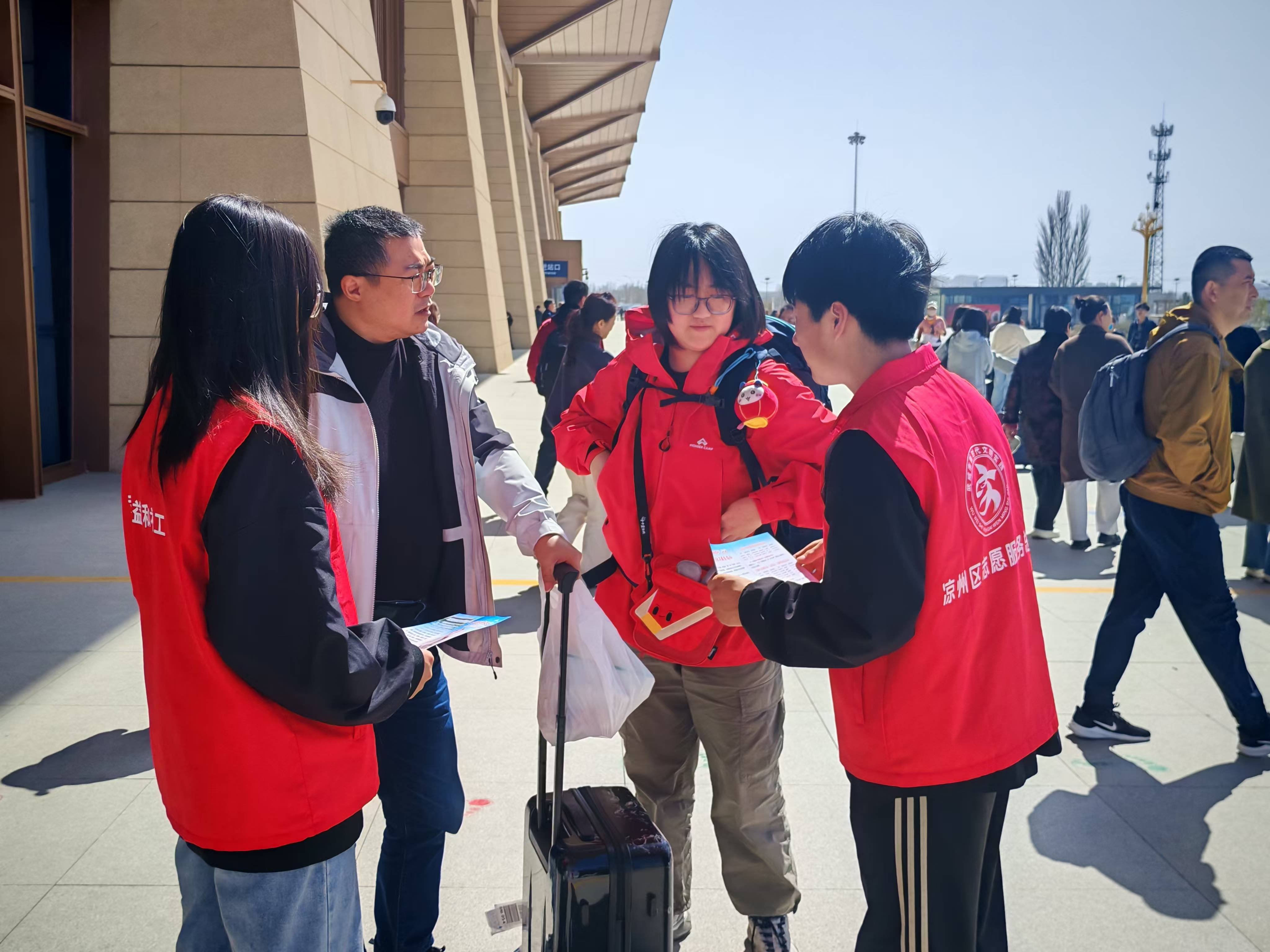在志愿服務(wù)站點(diǎn),志愿者們身穿紅馬甲,化身“沙漠綠洲向?qū)А?,?gòu)成一道暖心風(fēng)景線。他們熱情地為遠(yuǎn)道而來(lái)的全國(guó)各地植樹志愿者們提供暖心引導(dǎo),熱情細(xì)致告知前往民勤的乘車路線、換乘信息和注意事項(xiàng),并協(xié)助搬運(yùn)行李,引導(dǎo)植樹志愿者們有序乘車,用實(shí)際行動(dòng)詮釋了新時(shí)代青年的責(zé)任與擔(dān)當(dāng)。