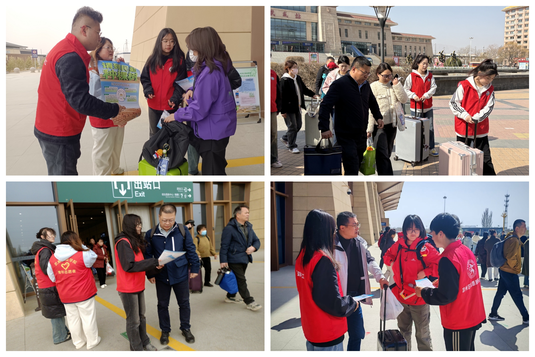 助力“請到民勤種棵樹”活動。宣傳統(tǒng)戰(zhàn)部、校團(tuán)委組織志愿者在武威高鐵站、火車站、客運(yùn)中心設(shè)立志愿服務(wù)站,為前來參加“請到民勤種棵樹”活動的志愿者們提供引導(dǎo)服務(wù),詳細(xì)告知前往民勤的乘車路線、換乘信息和注意事項(xiàng),協(xié)助搬運(yùn)行李,引導(dǎo)他們有序乘車。