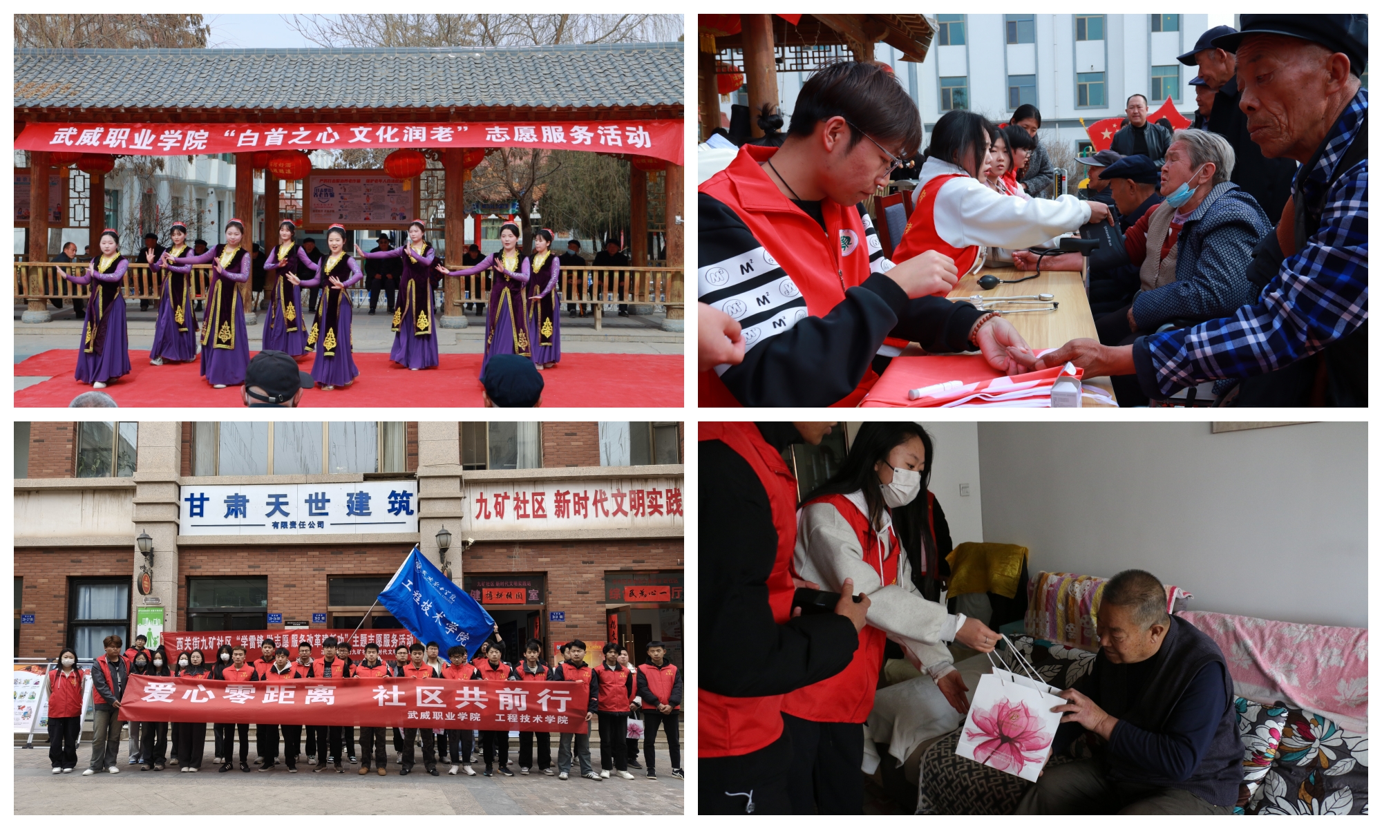 開展愛老敬老志愿服務(wù)活動。3月21日,校團(tuán)委組織50余名護(hù)理和學(xué)前教育專業(yè)志愿者,前往涼州區(qū)中心敬老院開展“白首之心·文化潤老”志愿服務(wù)活動,為老人捐贈生活用品和愛心物資,開展文藝表演慰問演出,為老人測量血壓、血糖,告知在日常生活起居中的注意事項(xiàng),以專業(yè)技能守護(hù)老人健康。3月5日,工程技術(shù)學(xué)院35名志愿者走進(jìn)西關(guān)街九條嶺礦區(qū)社區(qū),開展“愛心零距離社區(qū)共前行”志愿服務(wù)活動,為社區(qū)孤寡老人、獨(dú)居老人和老黨員等特殊家庭送上慰問品,打掃衛(wèi)生、擦拭家具,幫忙照料綠植,并與社區(qū)工作者一起規(guī)范擺放社區(qū)內(nèi)亂停亂放的自行車、電動車,清潔窗戶、地面,營造整潔有序的社區(qū)環(huán)境。