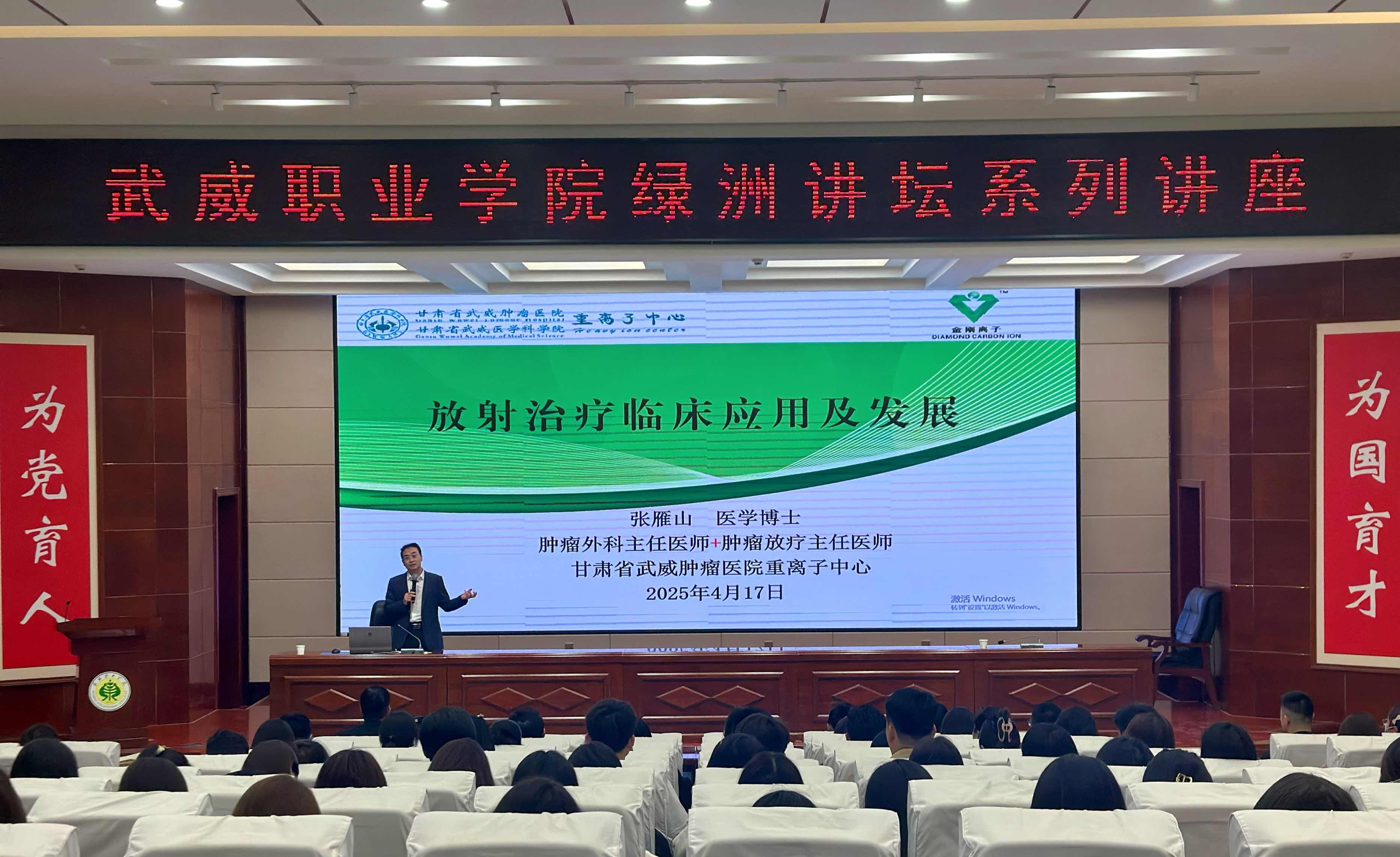 4月17日,學(xué)校特邀甘肅省武威腫瘤醫(yī)院副院長、重離子中心主任張雁山博士,在菁英廳作了“放射治療臨床應(yīng)用及發(fā)展”專題講座。學(xué)校黨委副書記翟存祥主持講座,醫(yī)學(xué)技術(shù)學(xué)院、藥學(xué)院、護(hù)理學(xué)院教師,2024級放射治療技術(shù)專業(yè)學(xué)生共210余人聆聽了講座。