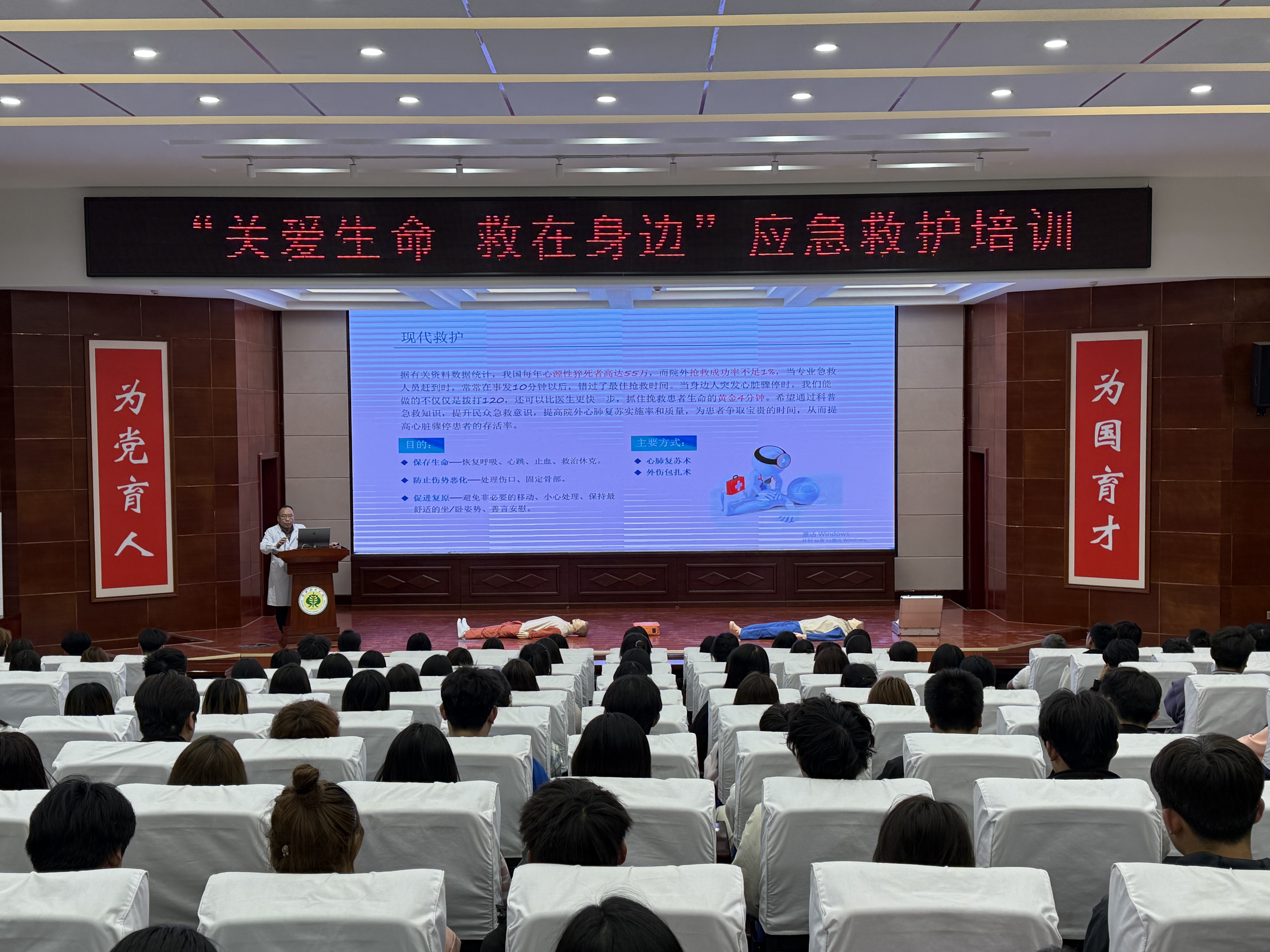 在理論環(huán)節(jié),武威市人民醫(yī)院急診科劉主任圍繞現(xiàn)代救護(hù)理念展開講解,重點(diǎn)強(qiáng)調(diào)“黃金4分鐘”在心肺復(fù)蘇中的關(guān)鍵作用,并詳細(xì)解讀心肺復(fù)蘇(CPR)操作流程、AED使用規(guī)范、海姆立克急救法及創(chuàng)傷救護(hù)技術(shù)。結(jié)合真實(shí)案例,劉主任糾正了“掐人中急救”“盲目搬動傷者”等常見誤區(qū),通過視頻演示和互動問答,幫助同學(xué)們掌握科學(xué)施救要點(diǎn)?!凹本仁敲總€公民的社會責(zé)任,關(guān)鍵時刻能挽救生命。”劉主任的講解深入淺出,現(xiàn)場學(xué)生認(rèn)真記錄,積極提問。?