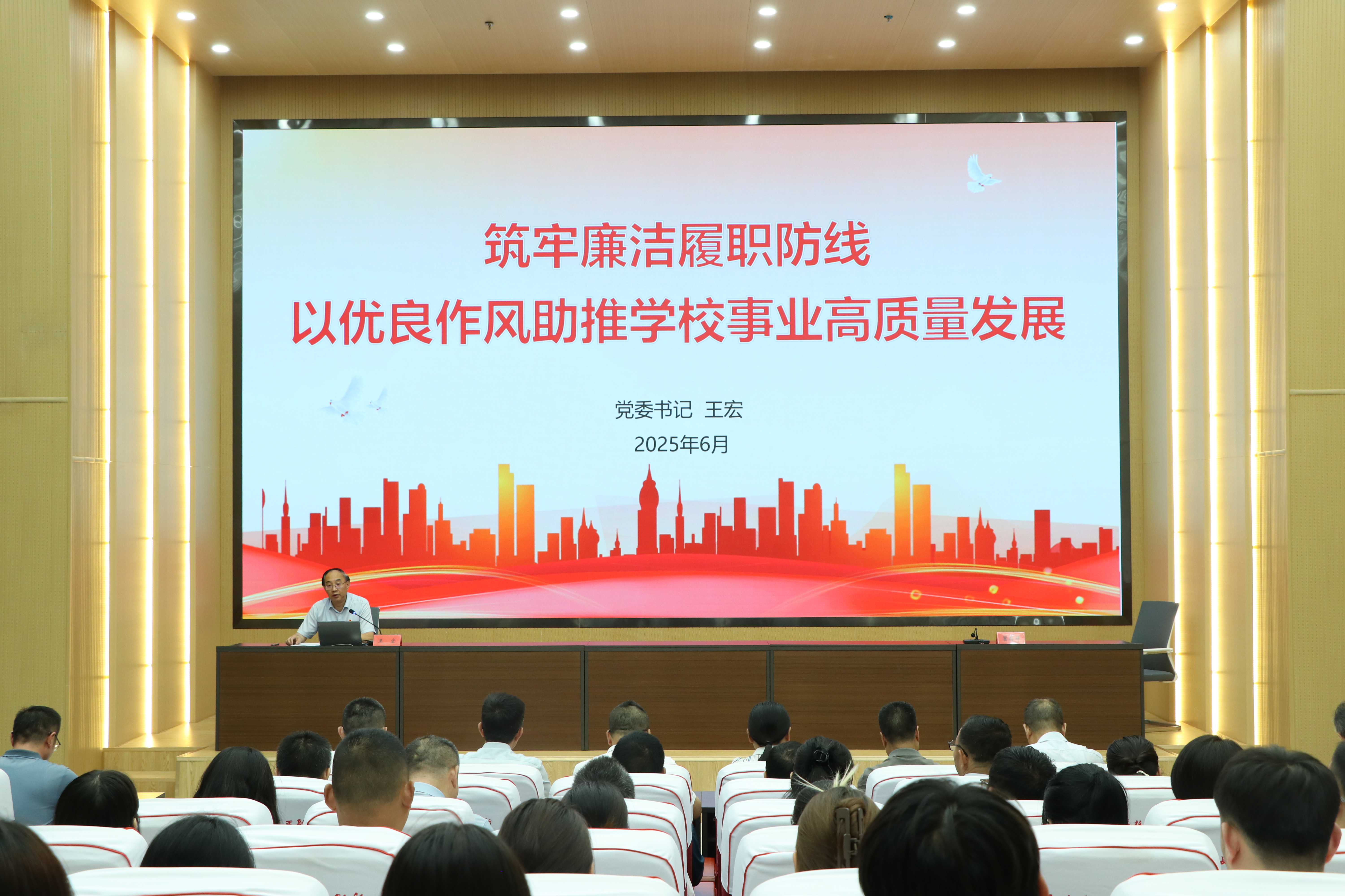 6月26日,黨委書記王宏以《筑牢廉潔履職防線 以優(yōu)良作風助推學校事業(yè)高質(zhì)量發(fā)展》為題講授專題黨課。王宏同志黨關(guān)系所在黨支部、聯(lián)系基層黨支部的教師黨員、學生黨員代表,學校年輕干部、新提拔干部、關(guān)鍵崗位干部代表,學習教育工作專班成員參加會議。黨委副書記翟存祥主持會議。