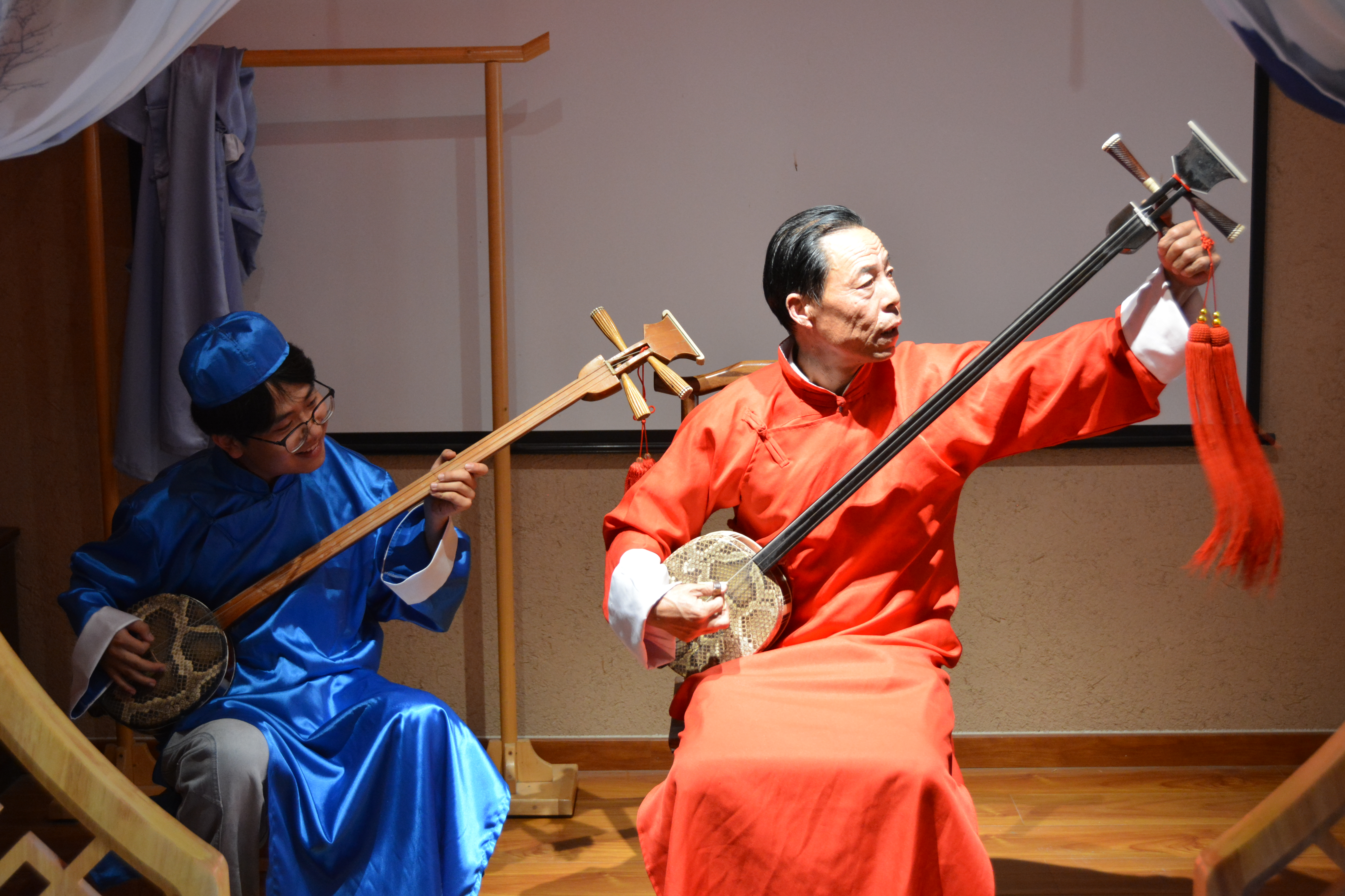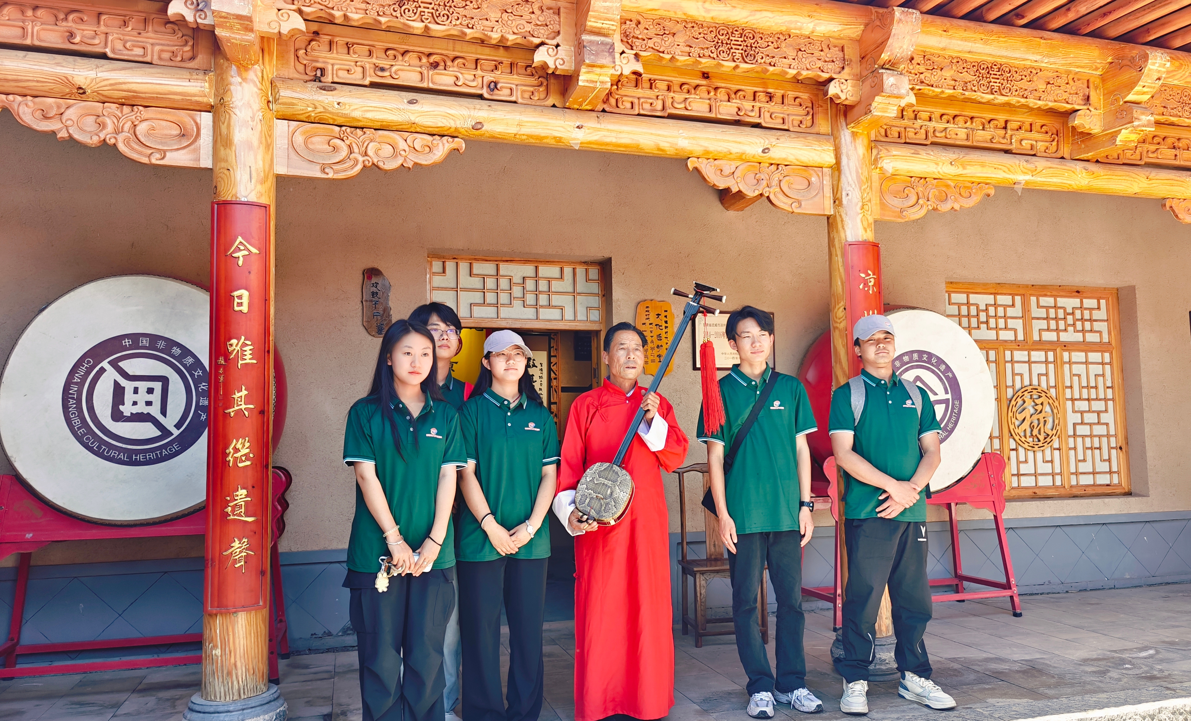 非遺民俗文化館當天化身成為一座流動的非遺課堂,實踐團成員們圍坐在古樸的庭院中,聚精會神地聆聽當?shù)刭Y深賢孝藝人董永虎老師深情演繹的經典曲目。老藝人蒼勁而富有穿透力的嗓音,伴著三弦琴弦的顫動,將一段段蘊含忠孝節(jié)義、勸人向善的古老故事娓娓道來。那飽經歲月洗禮的曲調,仿佛穿越時空,在青磚黛瓦間回蕩,讓在場的每一位學子都深深沉浸其中,體味著這門古老說唱藝術所承載的歷史重量與人文溫度。